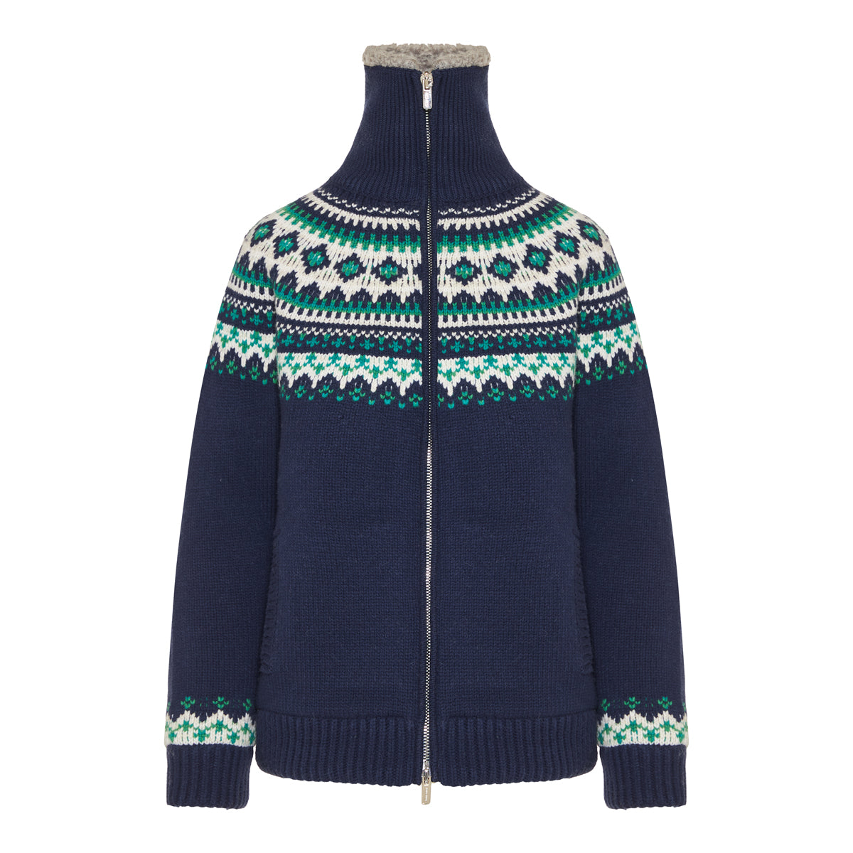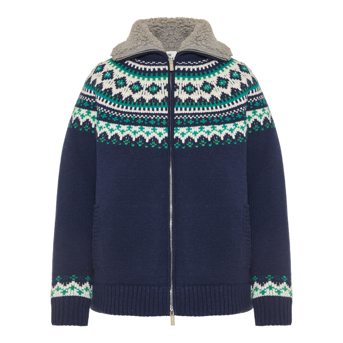 An oversized women’s cardigan by Miu Miu crafted in virgin wool with a fleece lining, featuring a front zipper closure, side pockets and ribbed cuffs and hem — designed for elevated casual and contemporary luxury layering.
