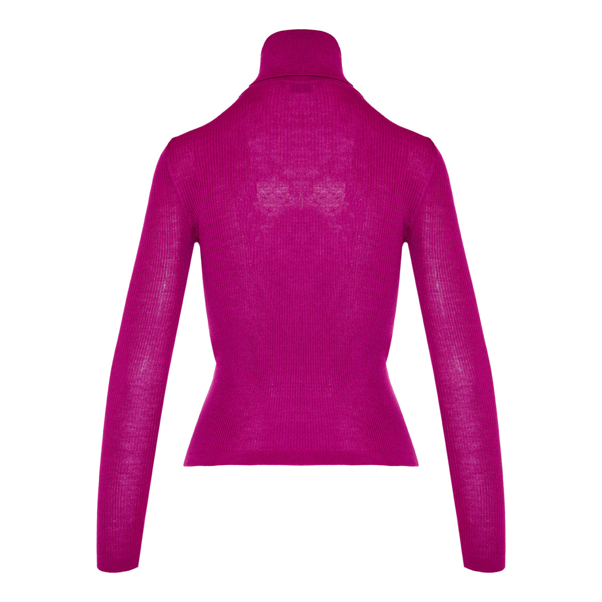 This fitted turtleneck top is crafted from a luxurious blend of certified cashmere, wool, and silk. It features an all-over ribbed knit, offering a sophisticated silhouette suitable for both formal and casual occasions.