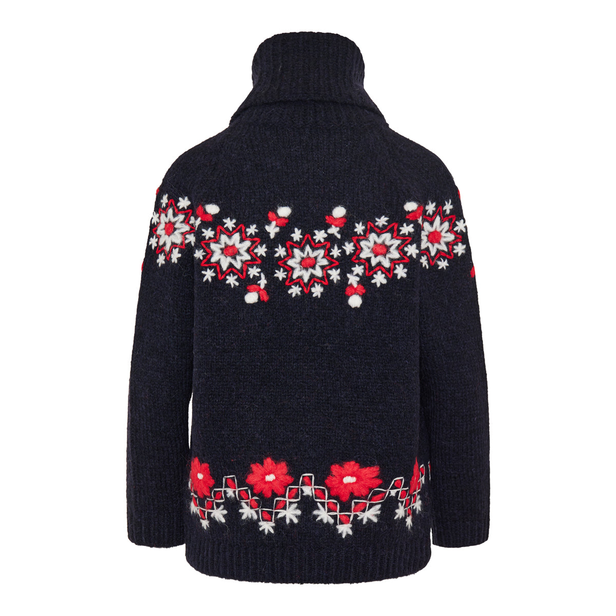 A luxurious alpaca‑wool turtleneck jumper by Moncler, combining artisanal embroidery with sumptuous knitwear craftsmanship. Its rich texture and classic alpine‑inspired motif give a refined, cozy elegance — ideal for elevated winter wardrobes, whether layered for ski‑chic looks or styled with tailored trousers for city wear.