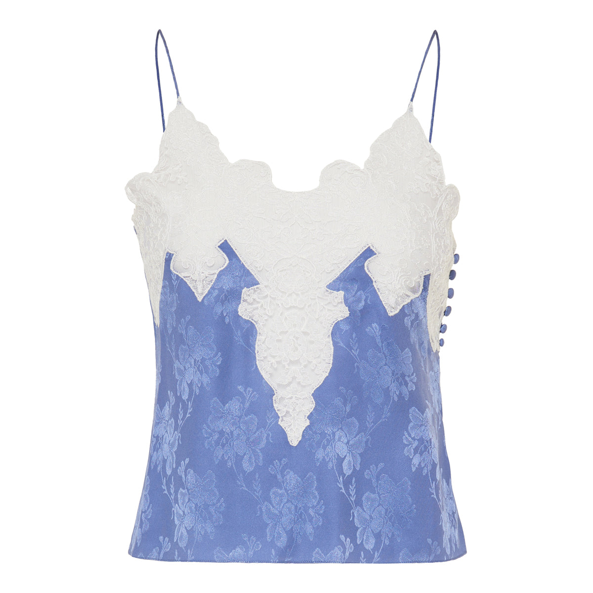 A fluid camisole top crafted from matte and shiny organic silk with a floral jacquard pattern. Features thin straps, lace inserts, and fabric-covered buttons at the side. Ideal for elegant occasions, this piece combines delicate craftsmanship with a timeless design.