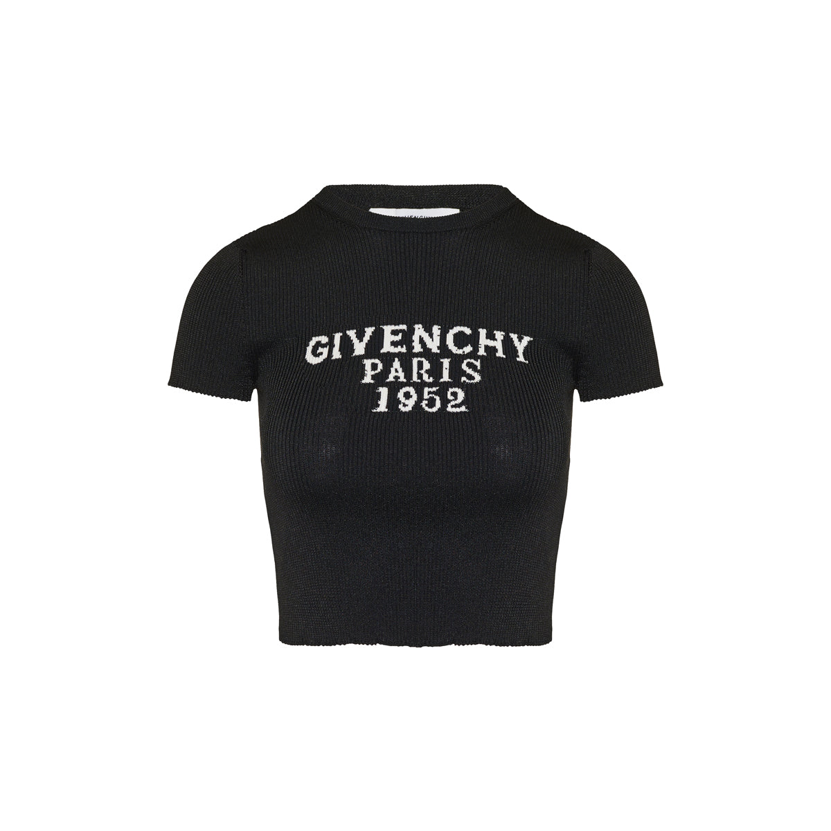 This cropped ribbed knit T-shirt is crafted from cotton. It features a crew neckline, short sleeves, and a fitted silhouette, finished with a lettering logo intarsia at the chest, offering a sophisticated yet casual look.