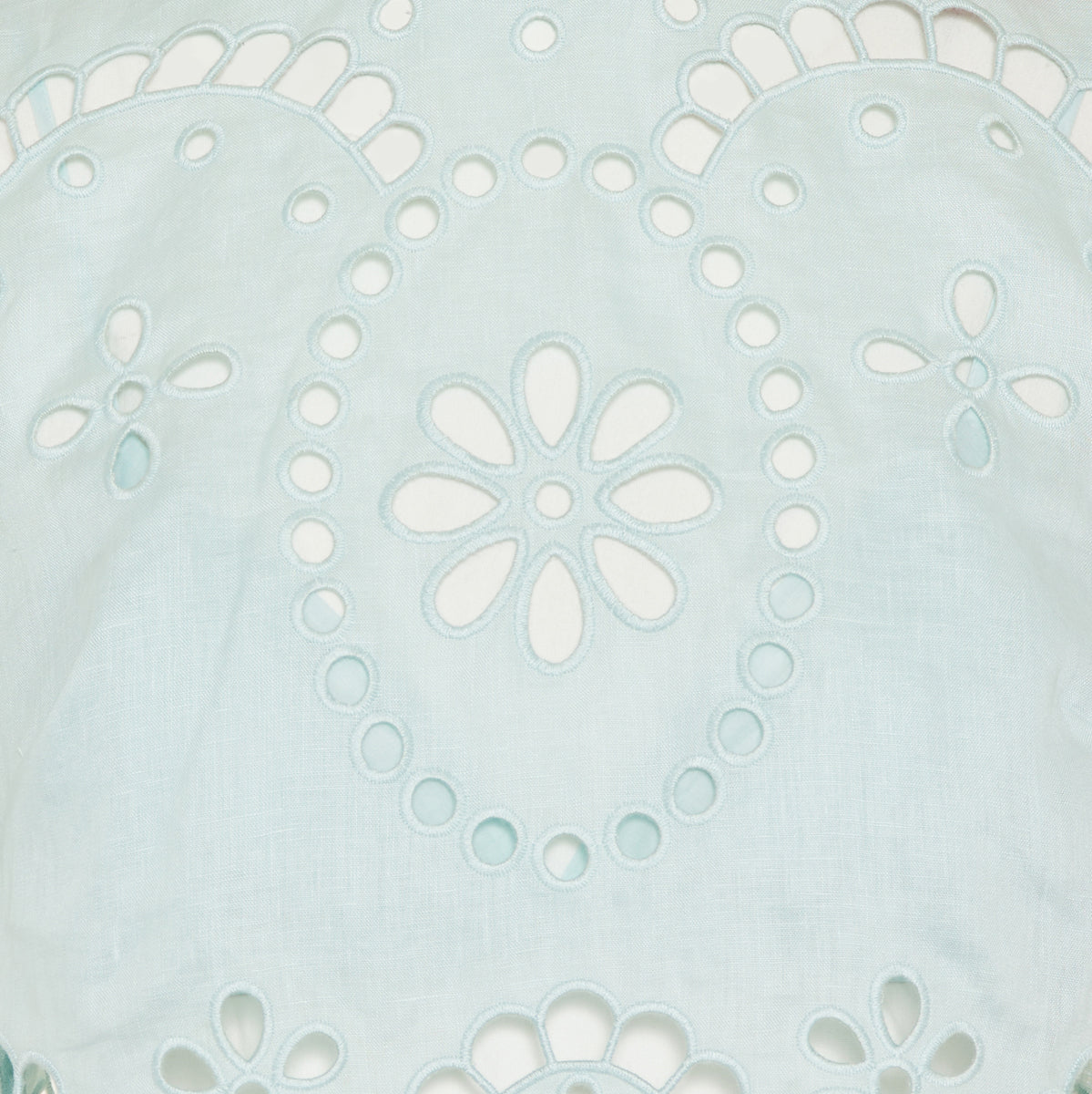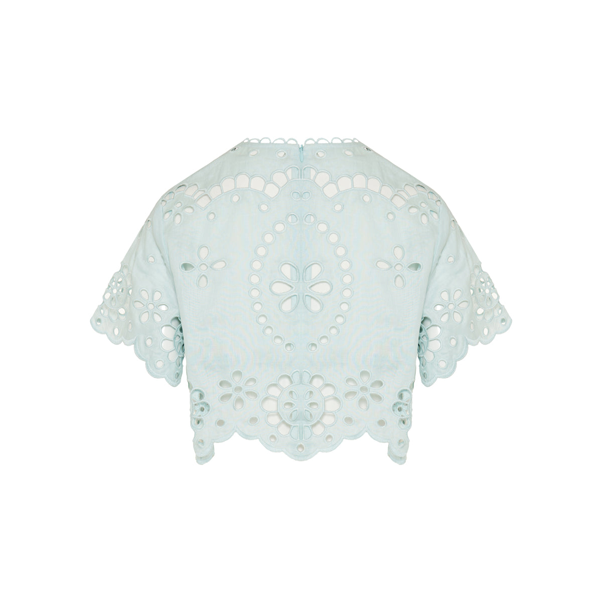A graceful cropped top by Zimmermann in broderie anglaise-embroidered linen, with scalloped trim at the neckline and sleeves and a discrete zip at the back — perfect for refined summer styling or elevated casual wear.
