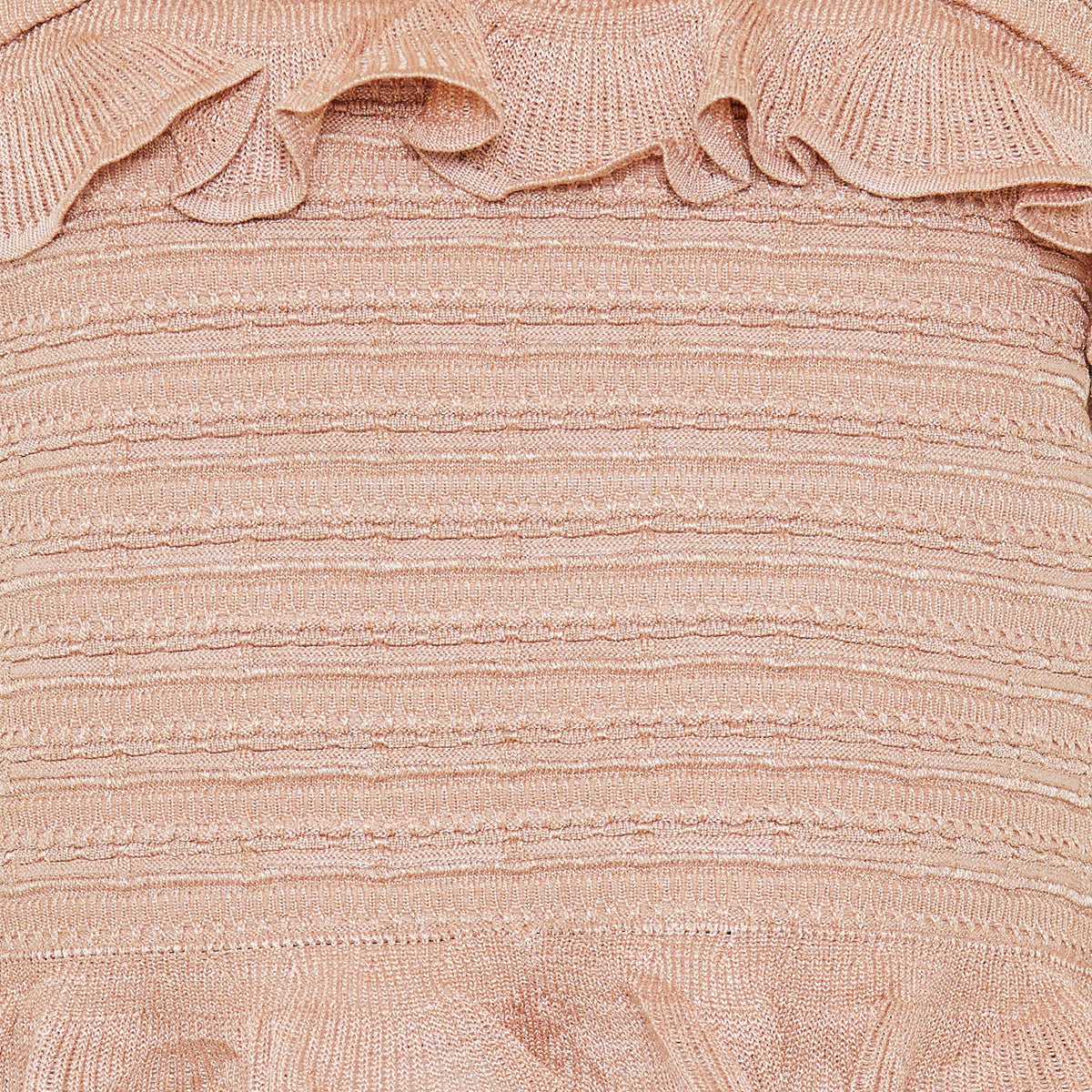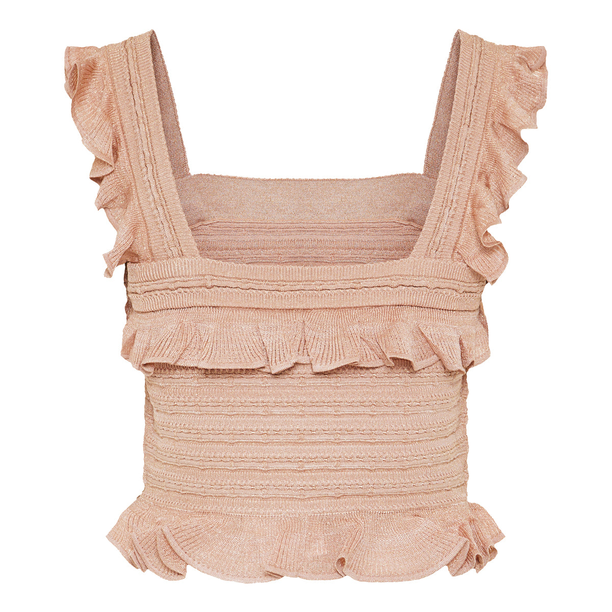A chic metallic rose‑gold cami with layered frill detailing and a square neckline, crafted for modern elegance. Its fitted knit silhouette and soft shimmer make it ideal for evening events or sophisticated party outfits. Perfect when paired with tailored trousers or a sleek skirt for a polished, contemporary look.