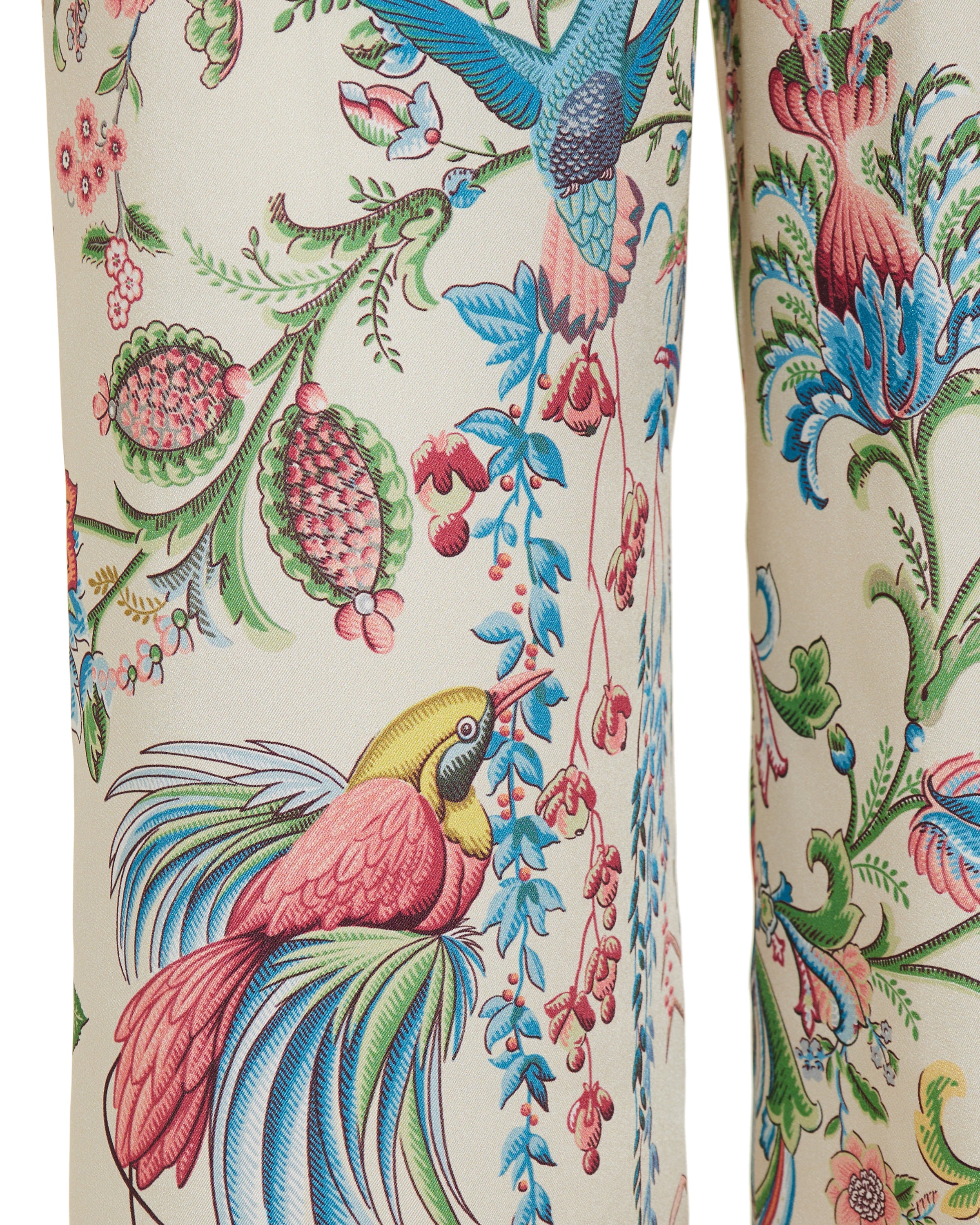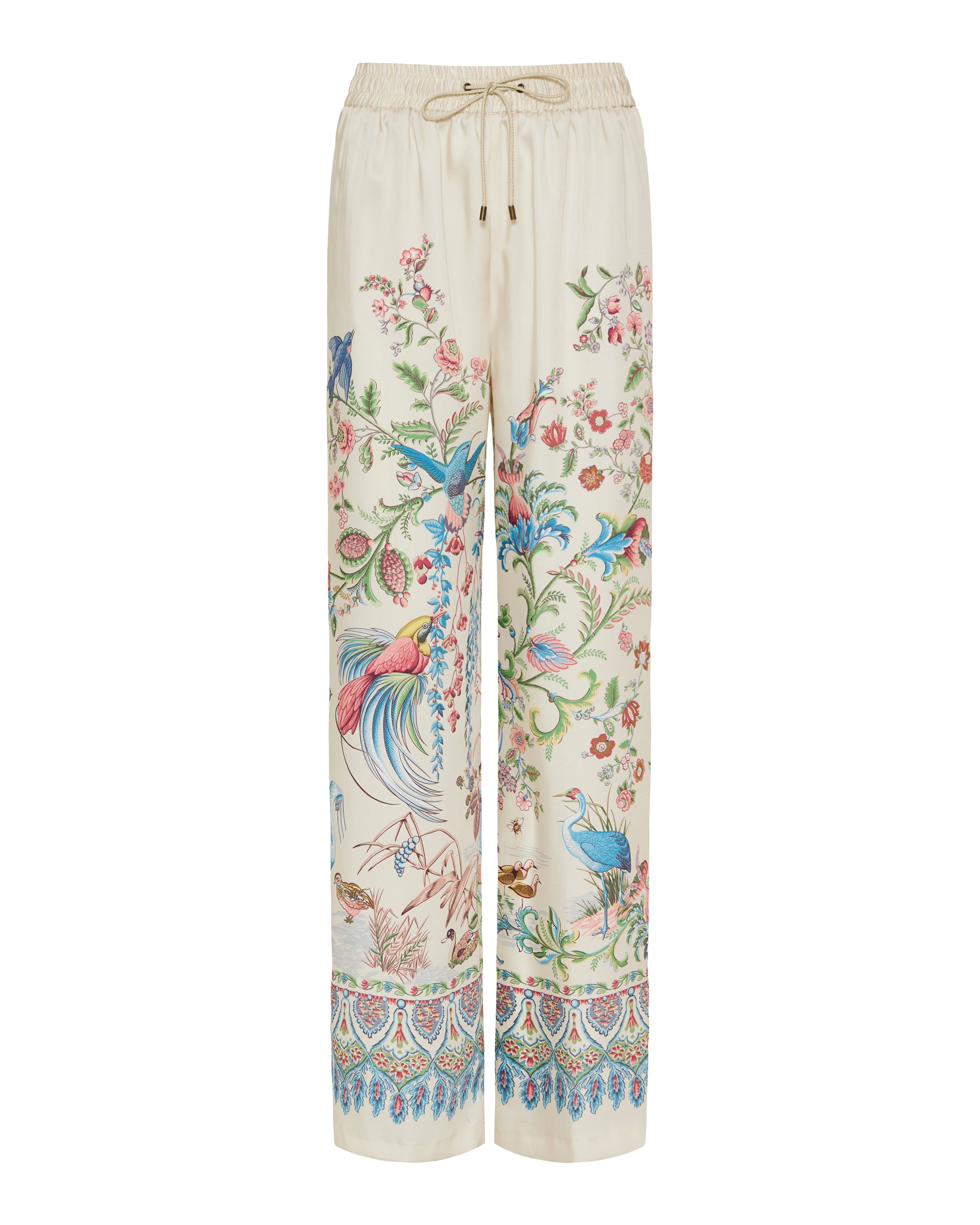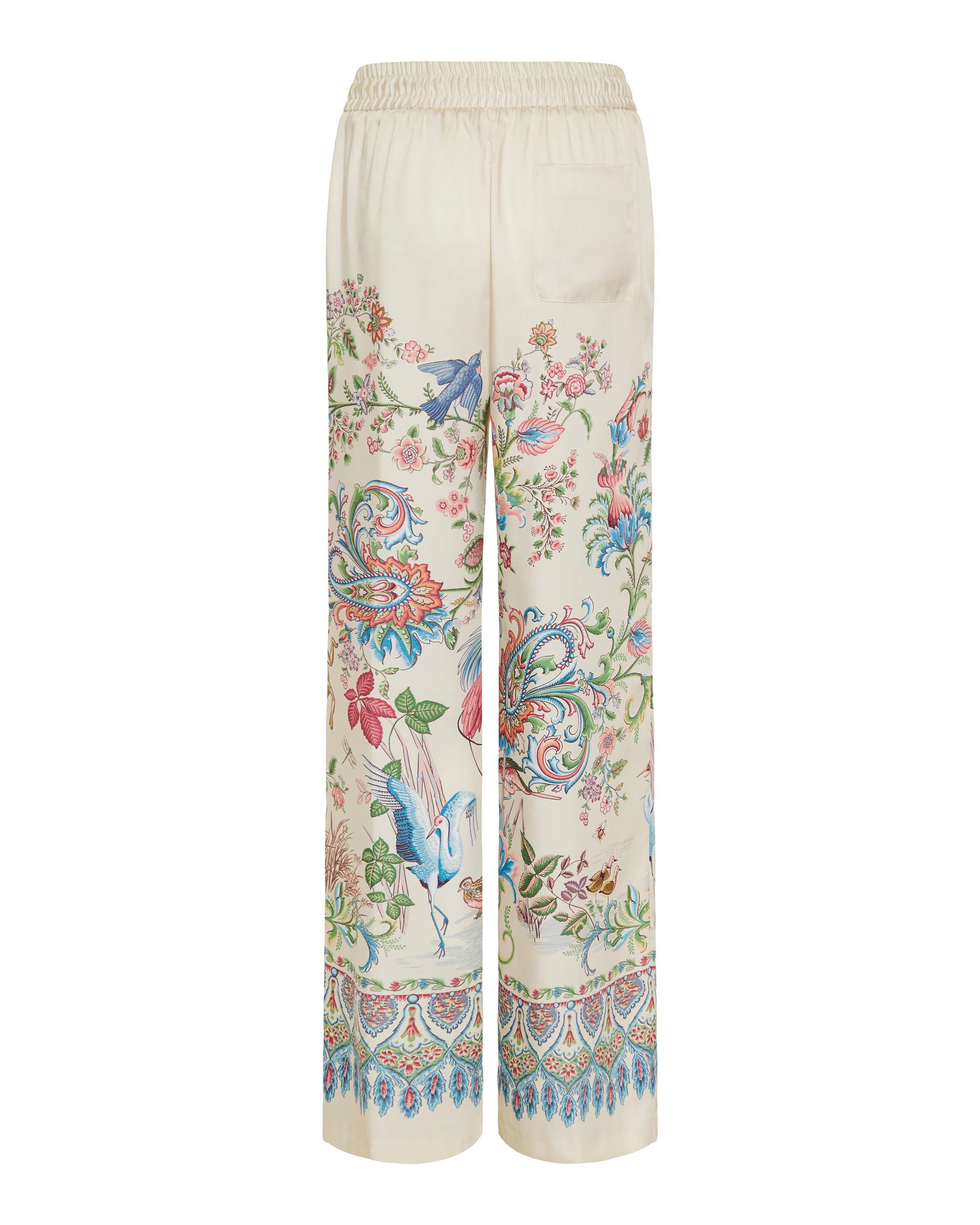 Luxurious wide‑leg trousers in ivory printed satin‑twill with a breezy silhouette and elasticated drawstring waist for effortless comfort. Cut for elevated casual and refined daytime wear, they are detailed with a vibrant array of exotic birds and floral motifs — embodying Etro’s signature artisanal style and Italian craftsmanship.