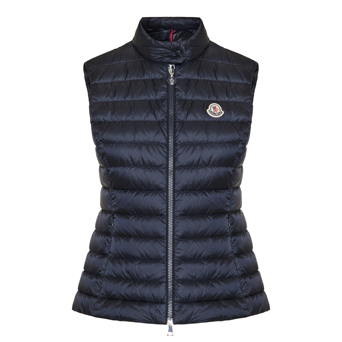 A polished down vest in navy blue that delivers warmth and shape, ideal for cold-weather layering or outdoor elegance. Crafted from polyamide with a cinched waist, high neckline, and logo Patch, it features zip pockets and a two-way zip with snap buttons to combine form and function in a refined design.