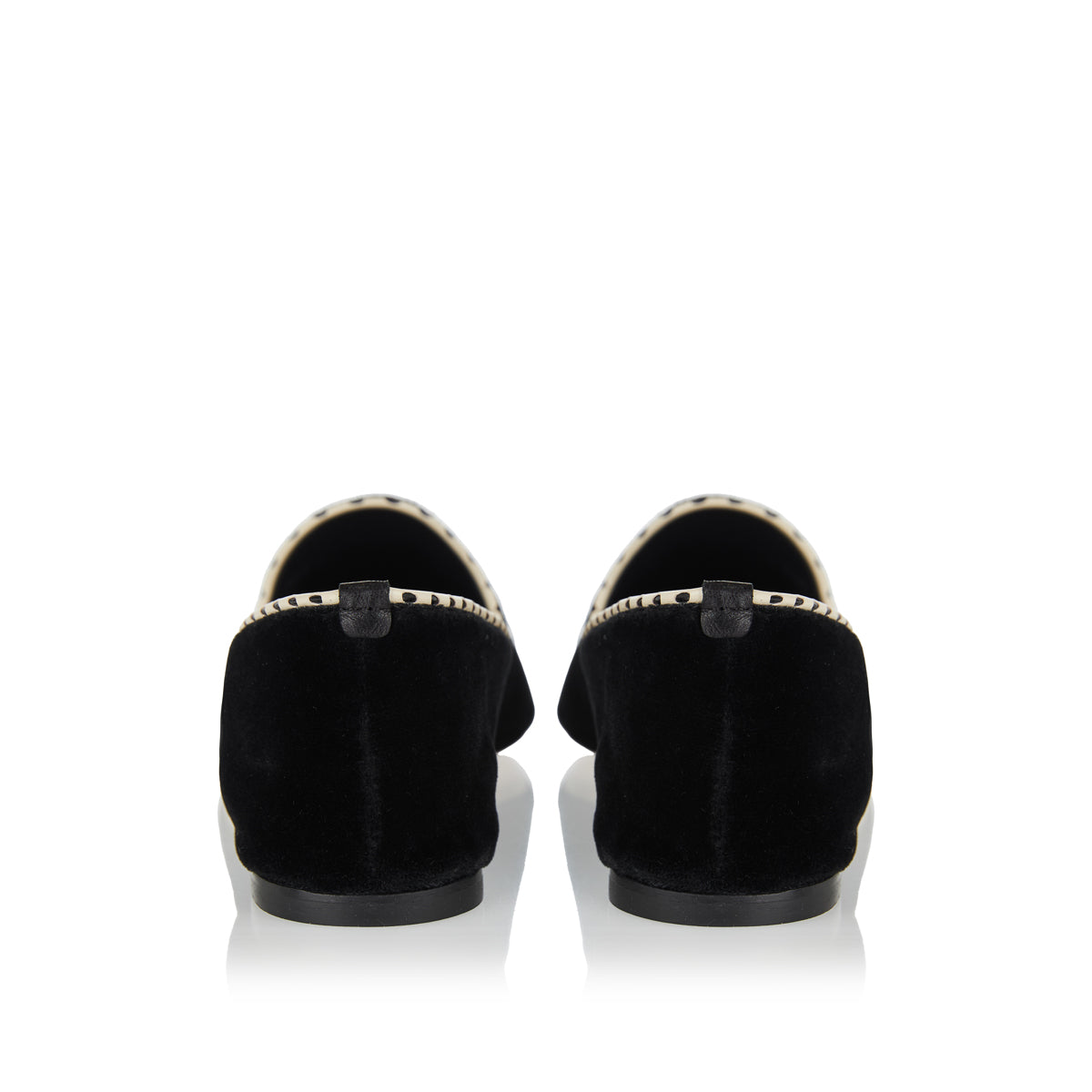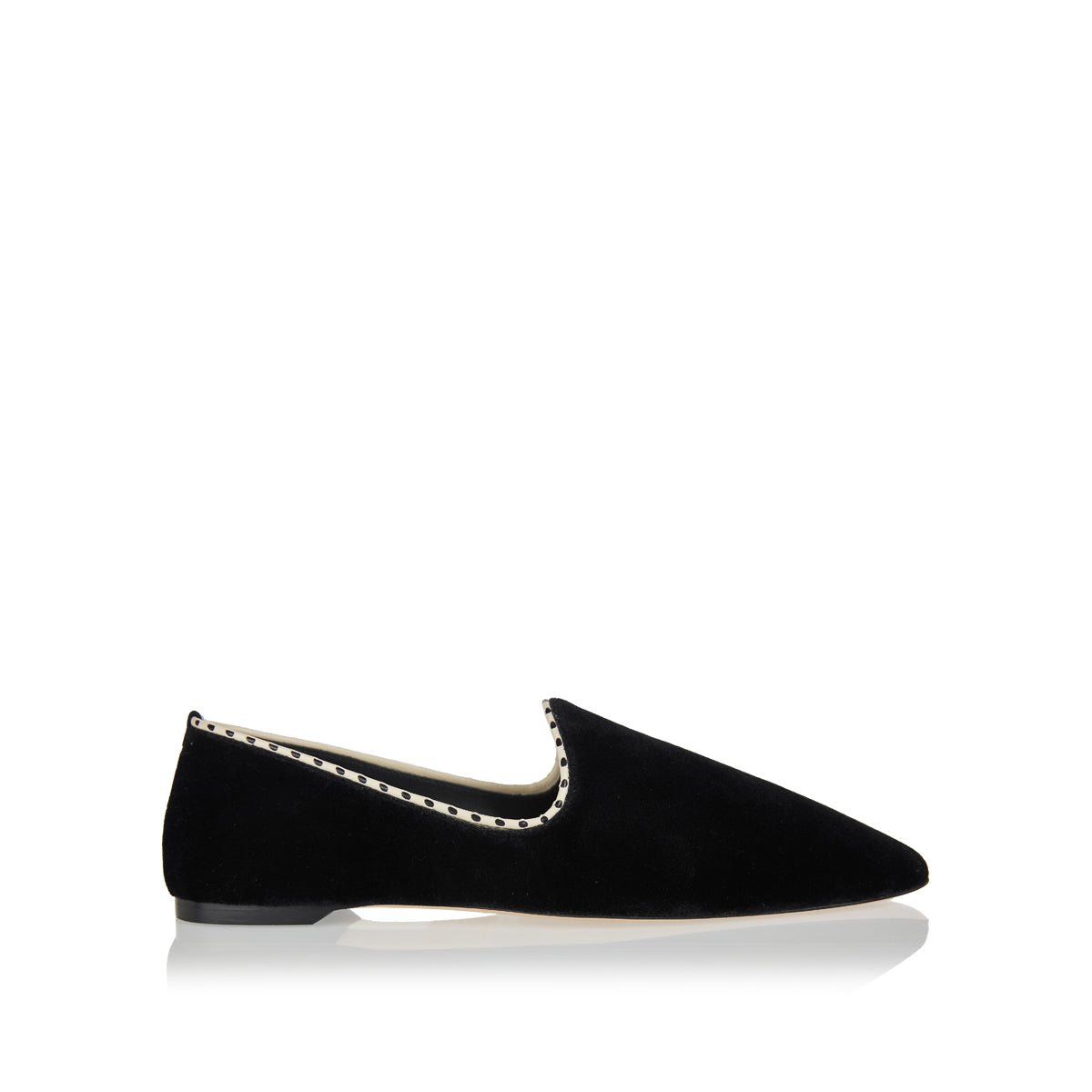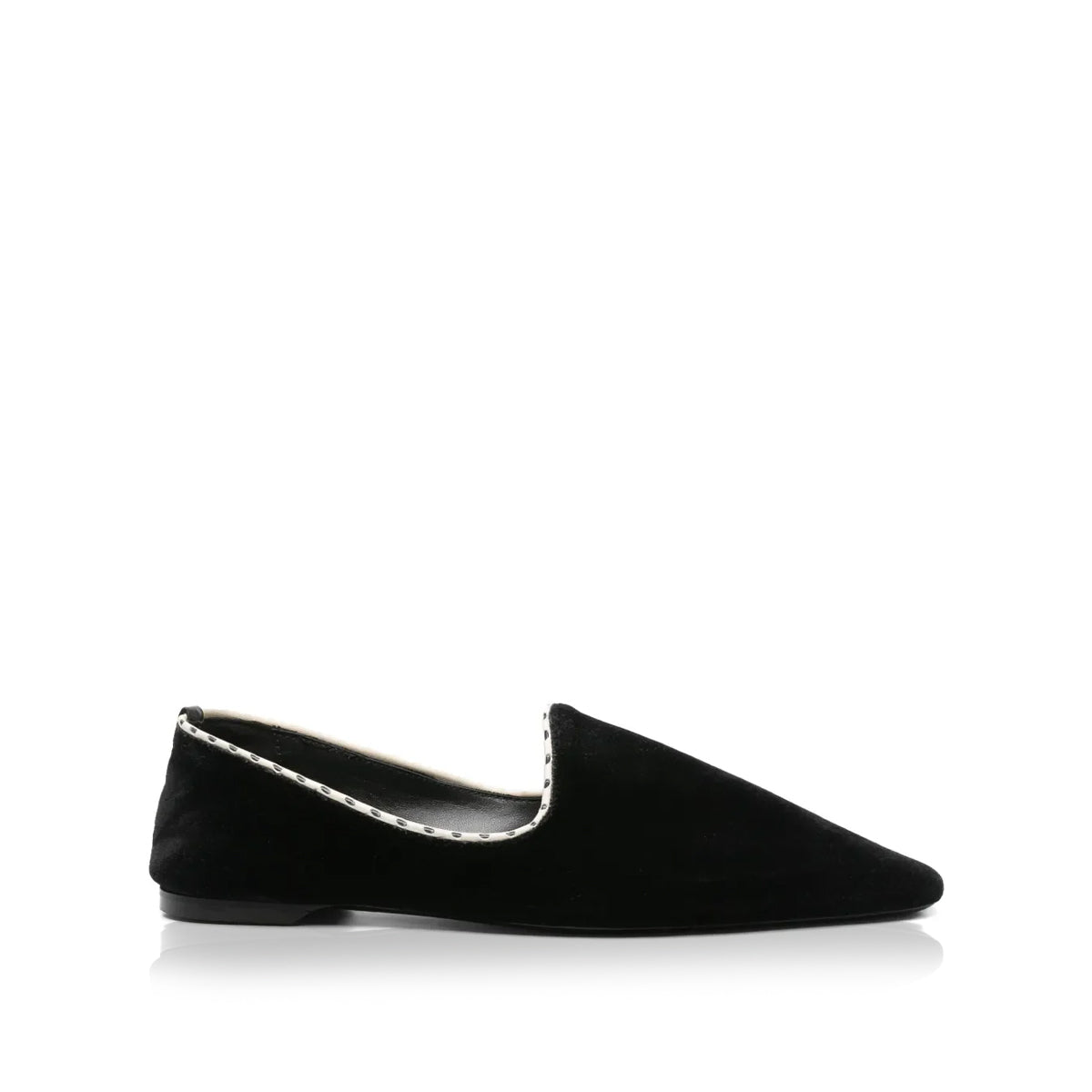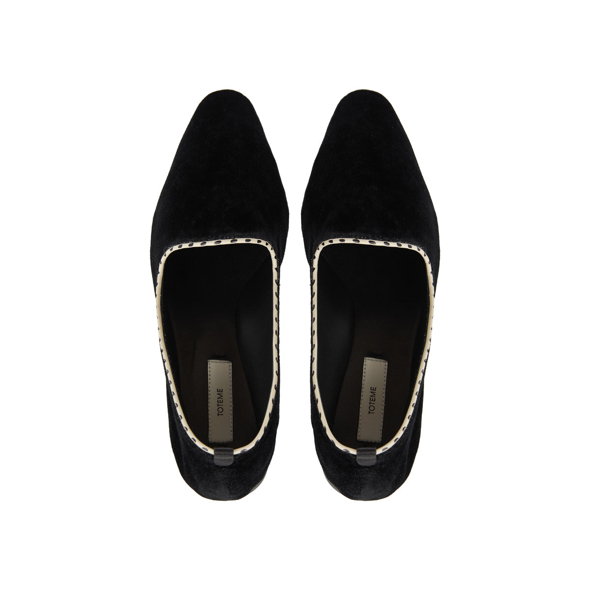 Toteme’s leather-lined velvet slippers are a refined take on minimalist footwear, crafted in black velvet with a luxurious leather lining. Designed with a sleek silhouette and slip-on ease, they embody the brand’s understated elegance and Scandinavian sophistication. A versatile style that complements both casual and elevated ensembles.