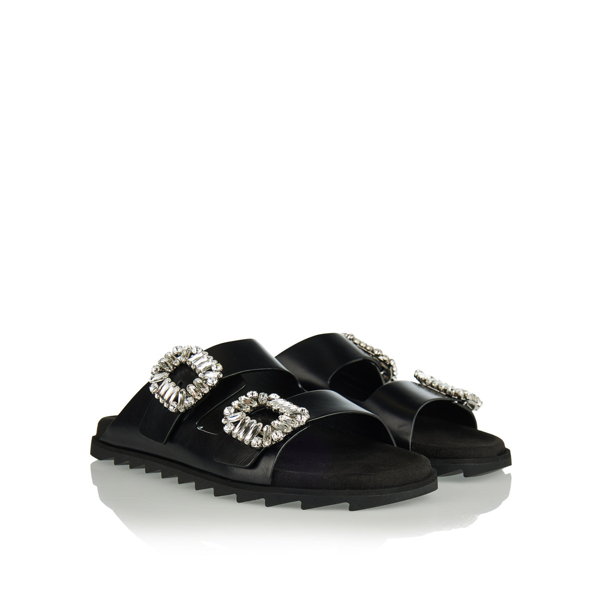 The Roger Vivier Viv' crystal-embellished buckle sandals are a luxurious fusion of comfort and glamour. Crafted from soft leather, these sandals feature oversized crystal-embellished buckles and a moulded footbed for all-day comfort. The ridged, jagged sole adds a touch of modern edge, making them perfect for both casual and dressy occasions.