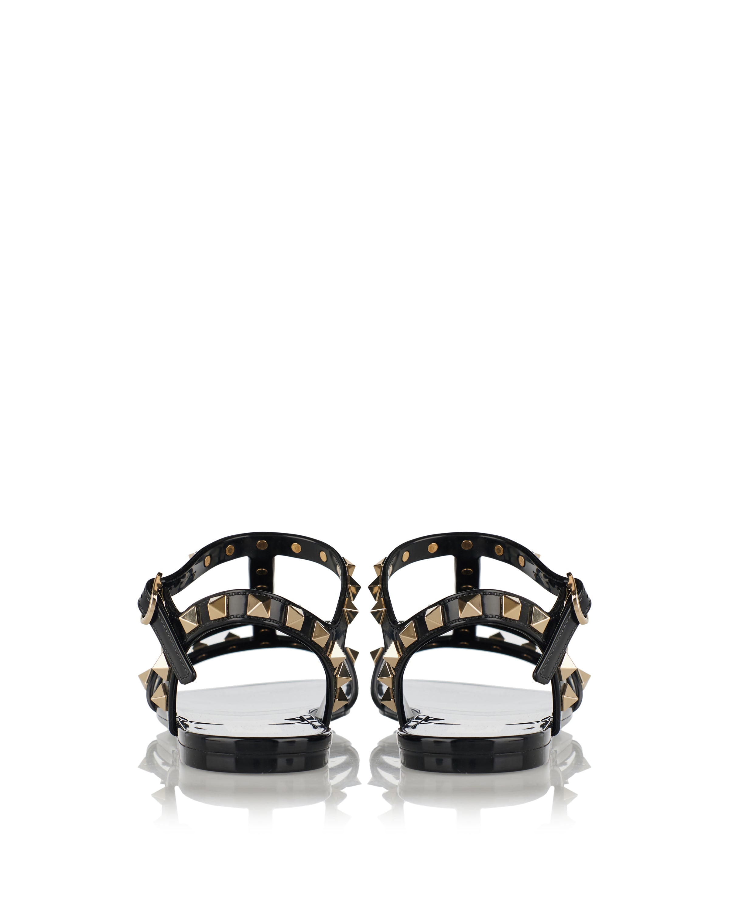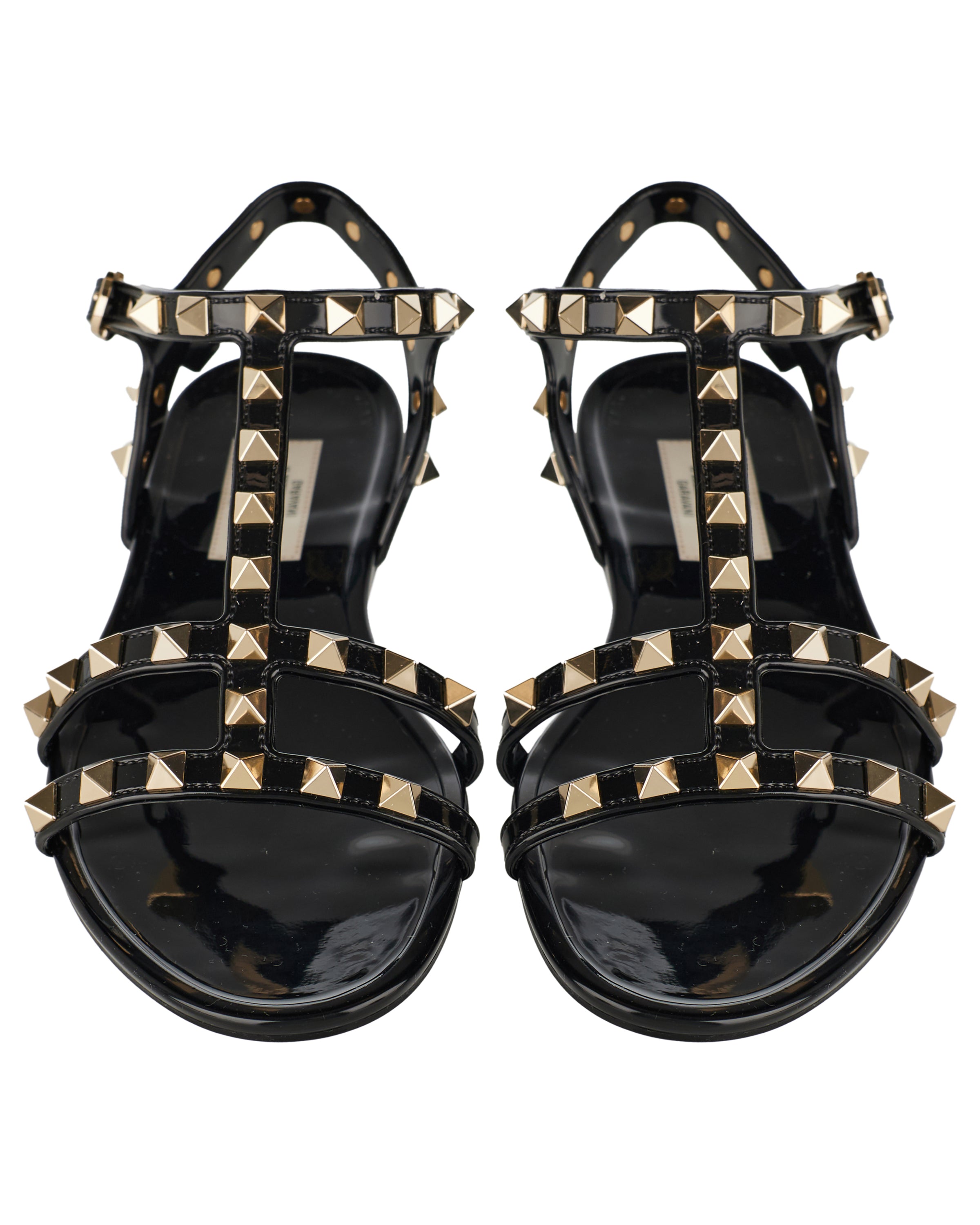 These black sandals are crafted from glossy pvc in a flat design embellished allover with gold studs. They have open toe and buckled ankle strap.