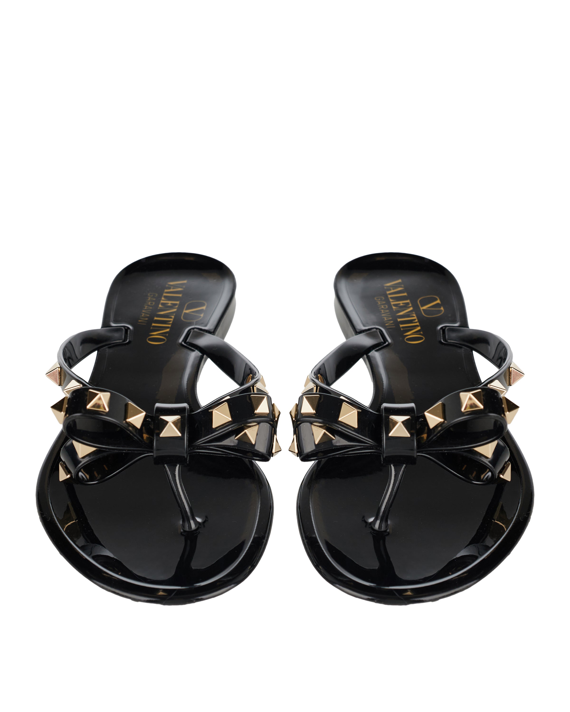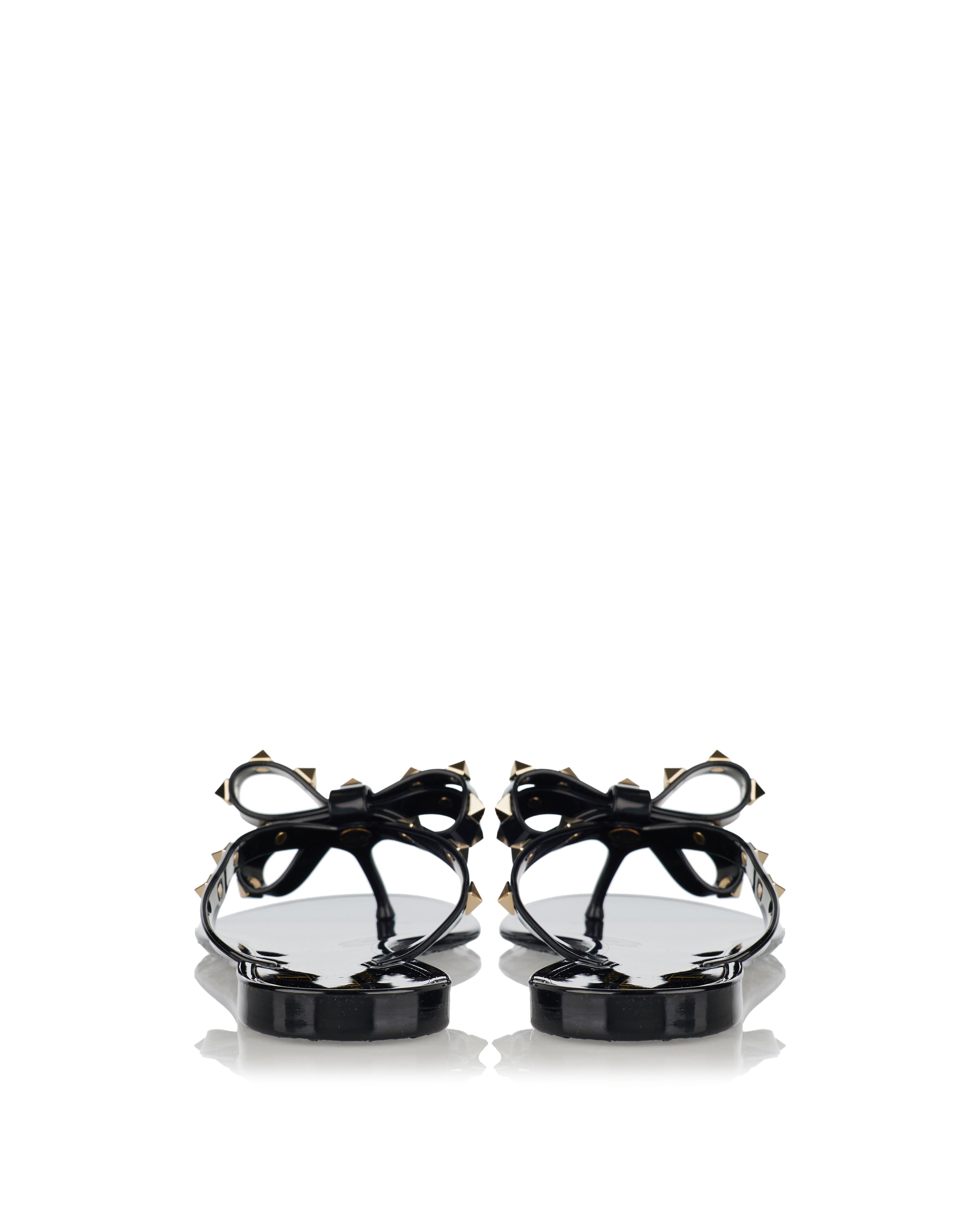 Valentino Garavani rockstud rubber flip flops in black are crafted in Italy from water-resistant rubber with an oversized bow and signature galvanised Rockstud embellishments on the straps. Designed for effortless slip-on wear, they bring elevated luxury to beach days and refined casual outfits alike with playful couture details.