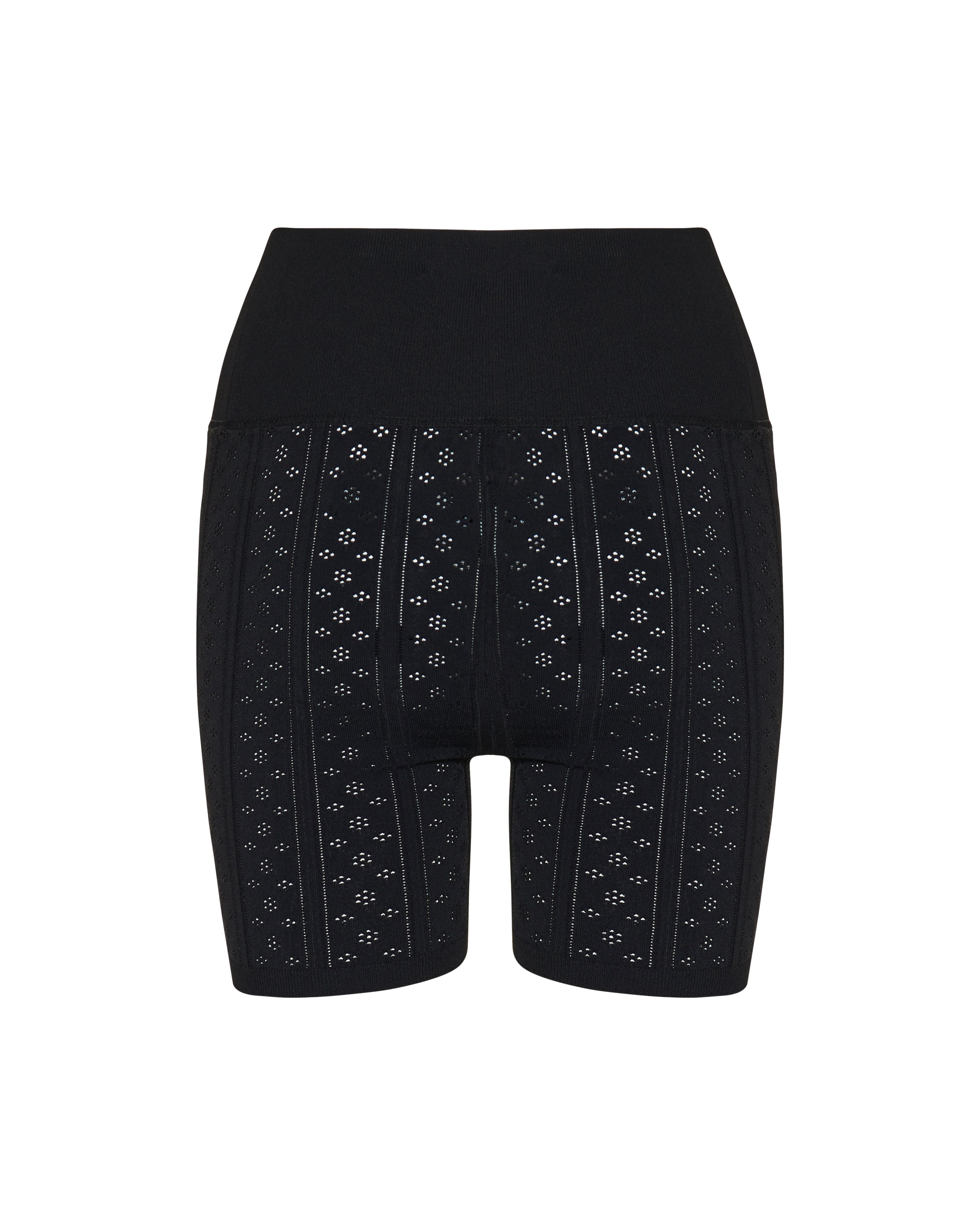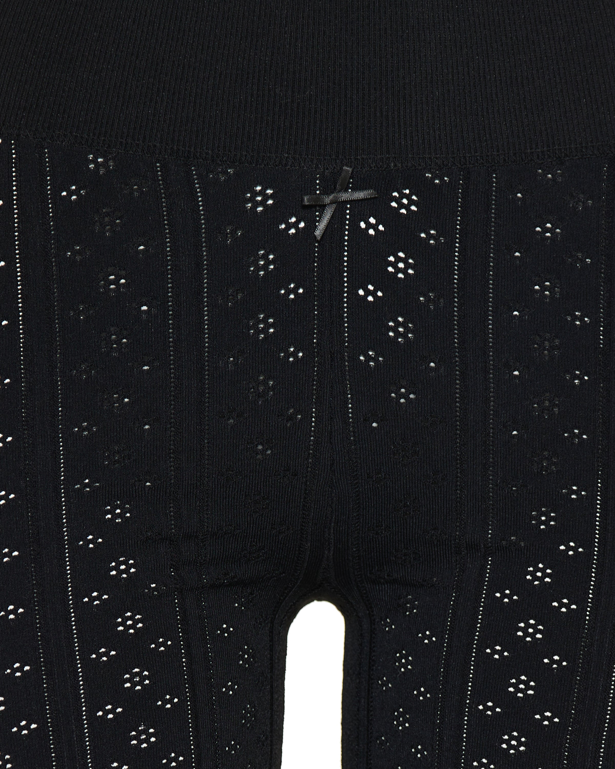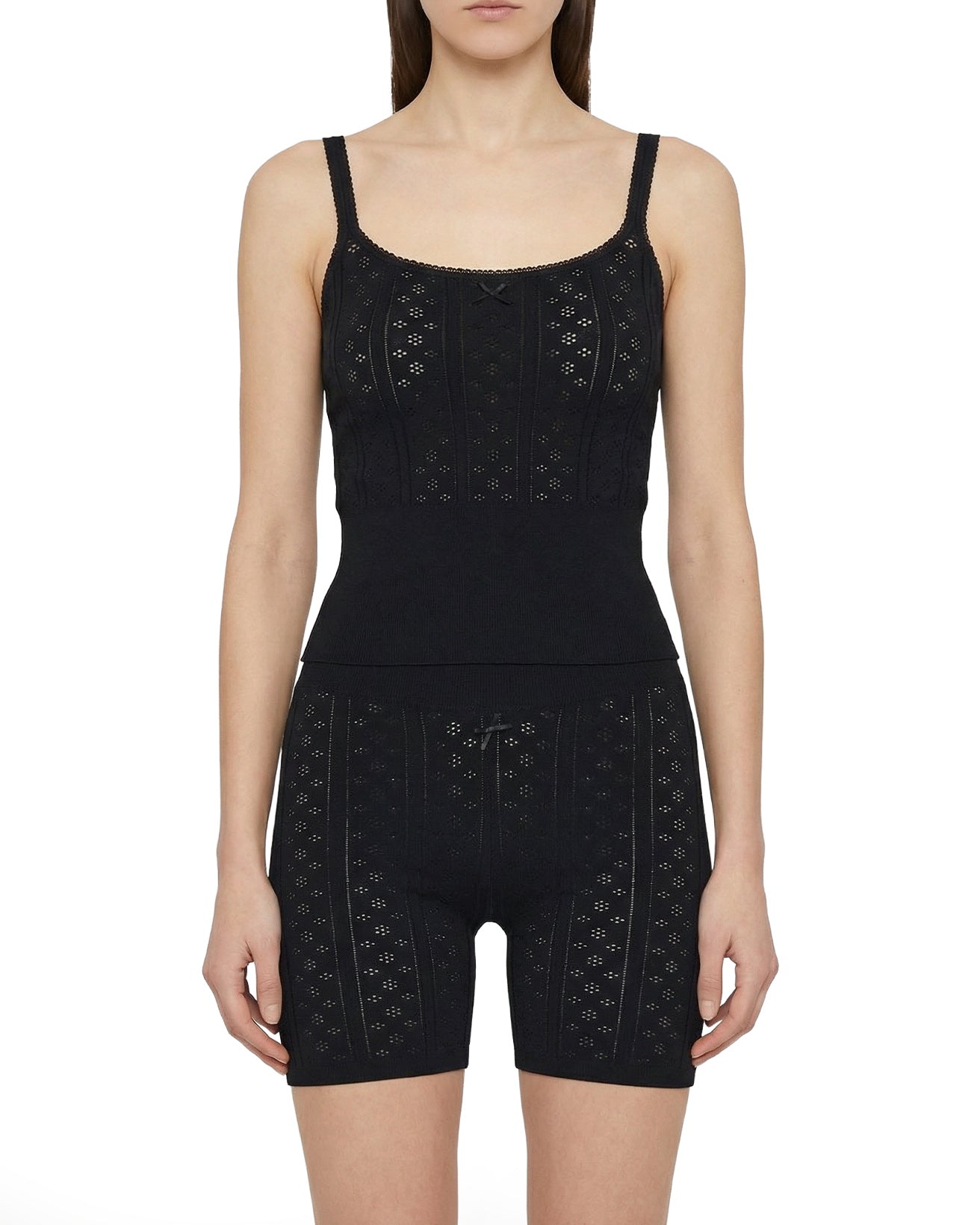 High-waisted shorts crafted from recycled pointelle knit with delicate bow embellishments in white. Designed for elevated casual and refined daytime wear, they combine sustainable materials with a feminine, relaxed silhouette. Ideal for chic summer styling or coordinated sets.