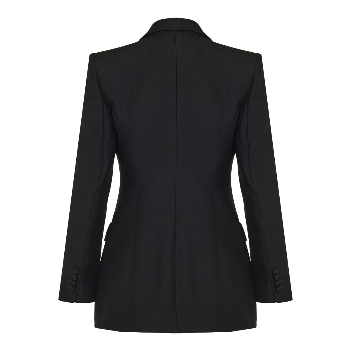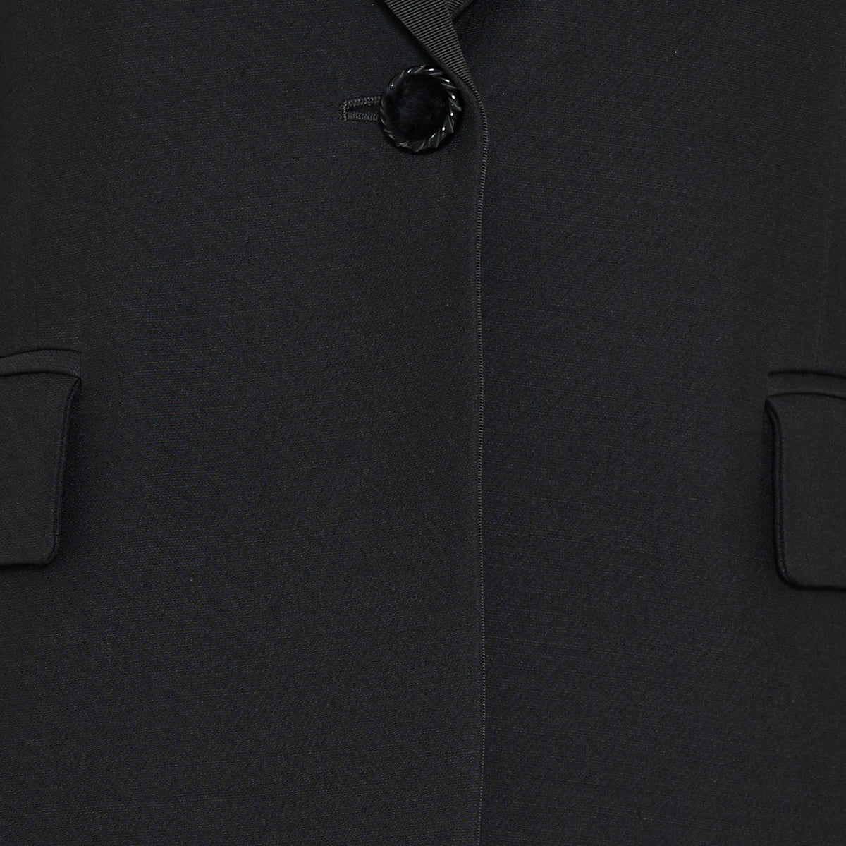 This Valentino blazer is crafted from virgin wool with tonal satin trim, featuring a clean single‑breasted front with self‑covered buttons, notch lapels, flap pockets, and buttoned cuffs. Tailored with modern structure and elegance, it suits polished everyday wear or elevated business styling.