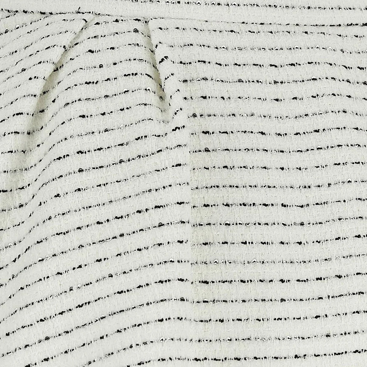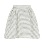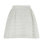 A refined tweed mini skirt featuring subtle micro-sequin detailing and pleated panels at the waist. The wheel-inspired construction adds movement, while the side zip and hook fastening ensure a clean silhouette. Ideal for going out or elevated daytime outfits.