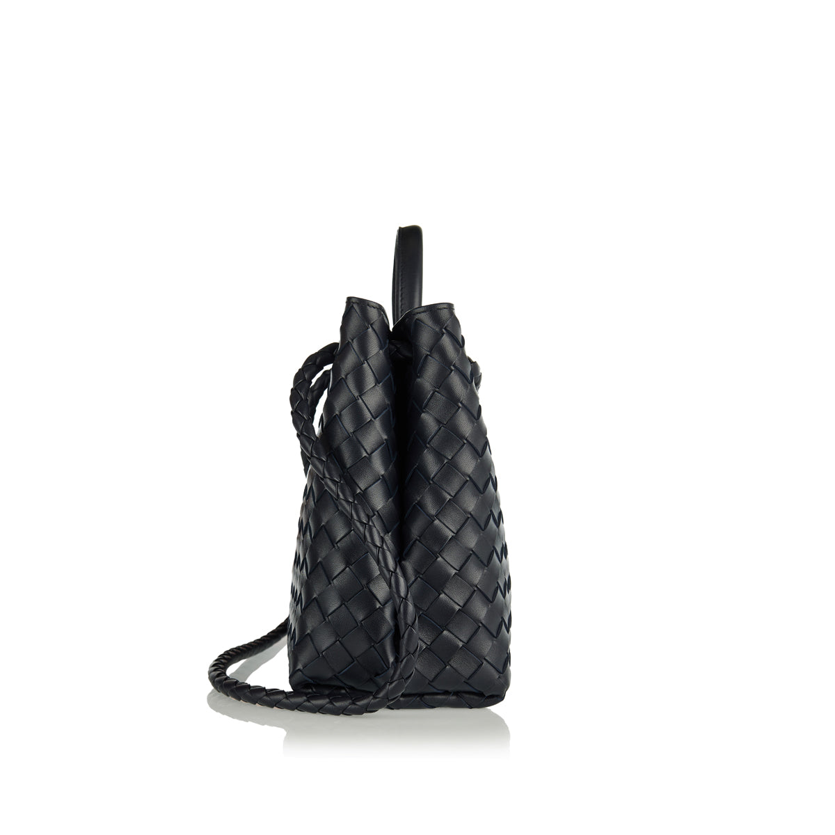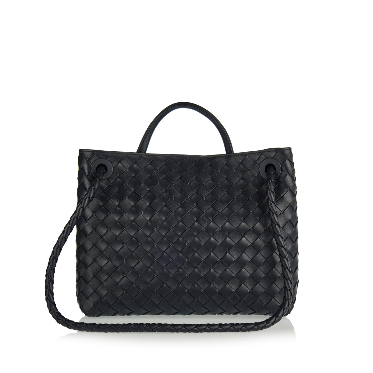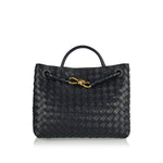 The Andiamo medium top handle bag is crafted in supple Intrecciato nappa leather with sliding cross-body strap and signature knot detail in gold at the front. It features compartmented interior with one zipped pocket, two open pockets and magnetic closure.