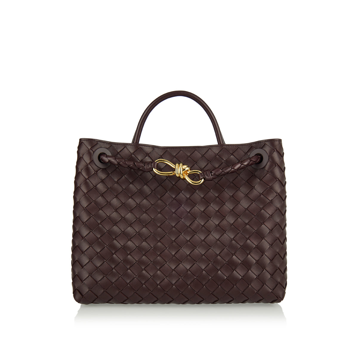 The Andiamo medium top handle bag is crafted in supple Intrecciato nappa leather with sliding cross-body strap and signature knot detail in gold at the front. It features compartmented interior with one zipped pocket, two open pockets and magnetic closure.