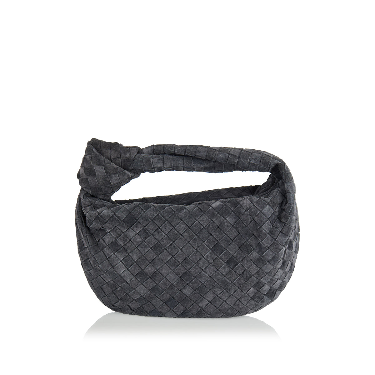Crafted from soft suede in grey, the Teen Jodie model has a rounded hobo silhouette handwoven in the label’s iconic Intrecciato pattern. It is shaped to a slouchy design with draping, finished with a knot on the top handle. The silver tone zipper opens to one internal compartment equipped with a zipper pocket.