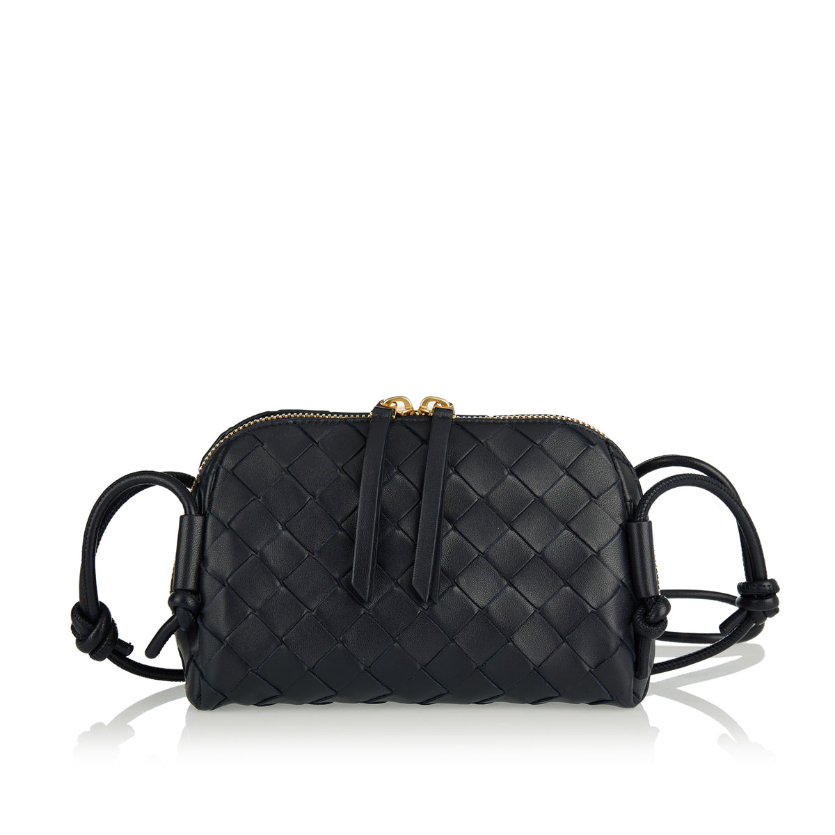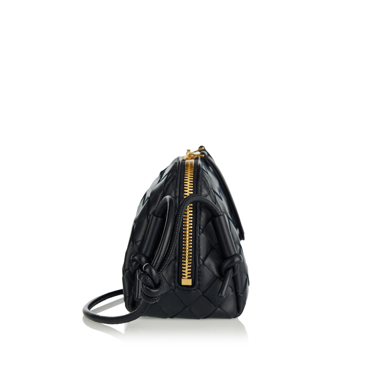 The Bottega Veneta Concert pouch in Black is a refined accessory crafted from Intrecciato lambskin leather. Featuring a minimalist design with a zip closure, adjustable tubular strap with sliding knots, and gold-tone hardware, it offers both style and functionality. Ideal for evening events or as a sophisticated everyday companion.