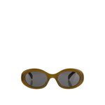 The Celine Triomphe 01 Sunglasses in Milky Olive feature a bold acetate frame with a distinctive oval shape. The design is complemented by smoke lenses that provide 100% UVA and UVB protection. Accentuated with the signature gold Triomphe motif on the temples, these sunglasses offer a blend of modern elegance and timeless luxury.