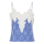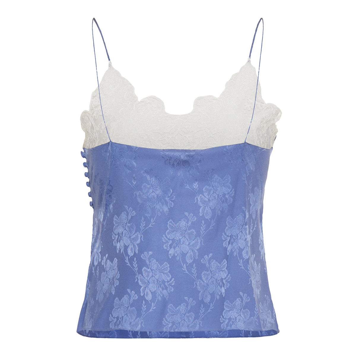 A fluid camisole top crafted from matte and shiny organic silk with a floral jacquard pattern. Features thin straps, lace inserts, and fabric-covered buttons at the side. Ideal for elegant occasions, this piece combines delicate craftsmanship with a timeless design.
