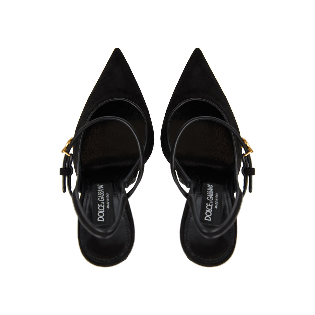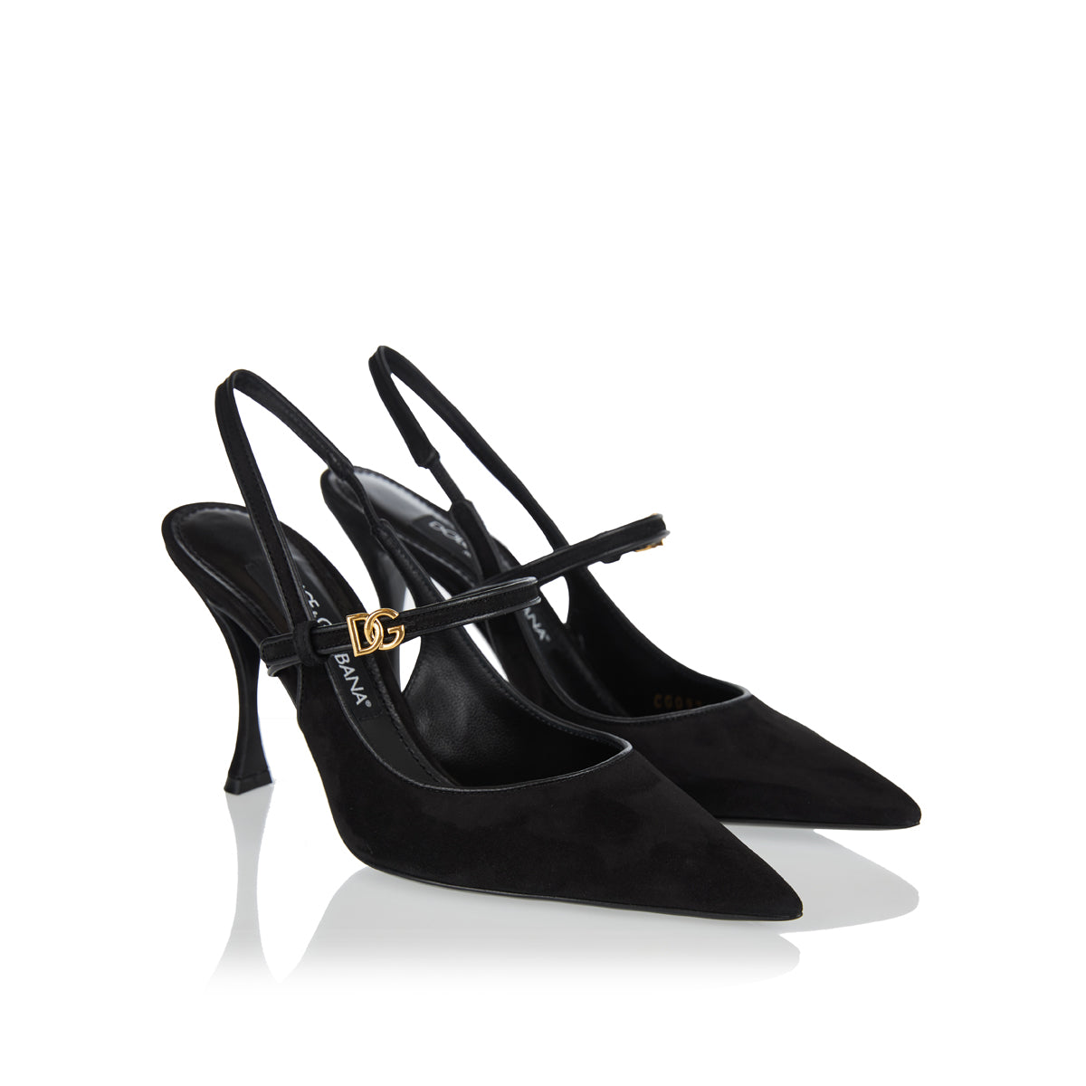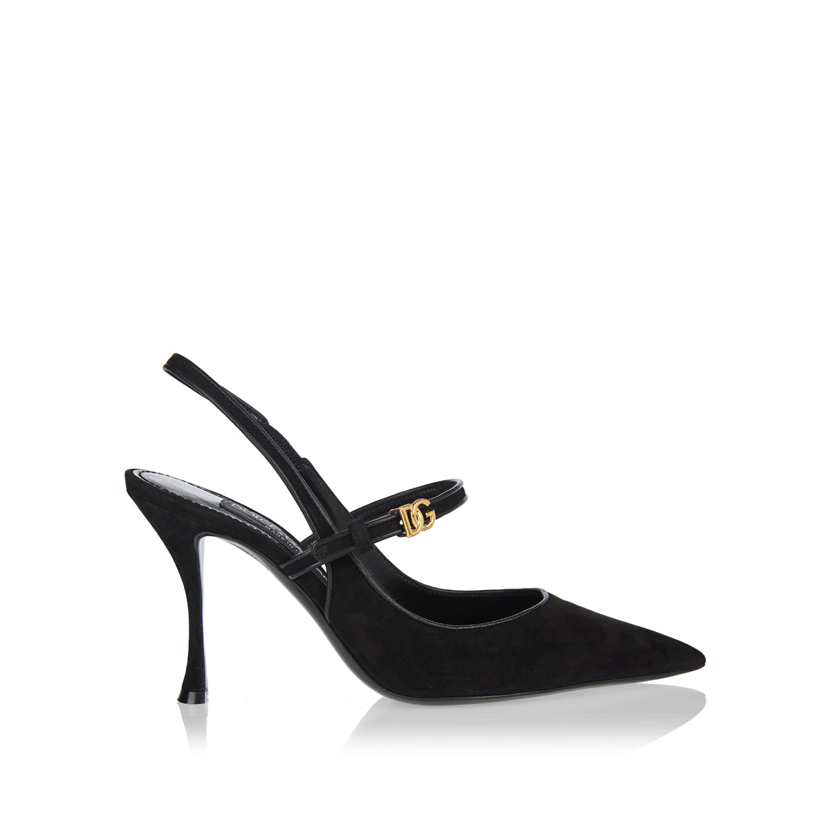 Crafted from supple suede in classic black, these slingback pumps feature a pointed toe, slender strap with a gold-tone logo buckle, and a sharply defined 90 mm stiletto heel. The rich materials and refined silhouette showcase Dolce & Gabbana’s understated yet bold craftsmanship.