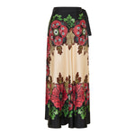 A luxurious silk twill skirt featuring the vibrant Bounty Placée print, characterized by bold floral motifs in rich red, ochre, and green tones. Designed with a wrap-around silhouette, this piece offers both elegance and versatility.