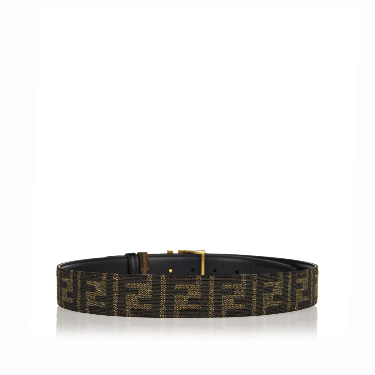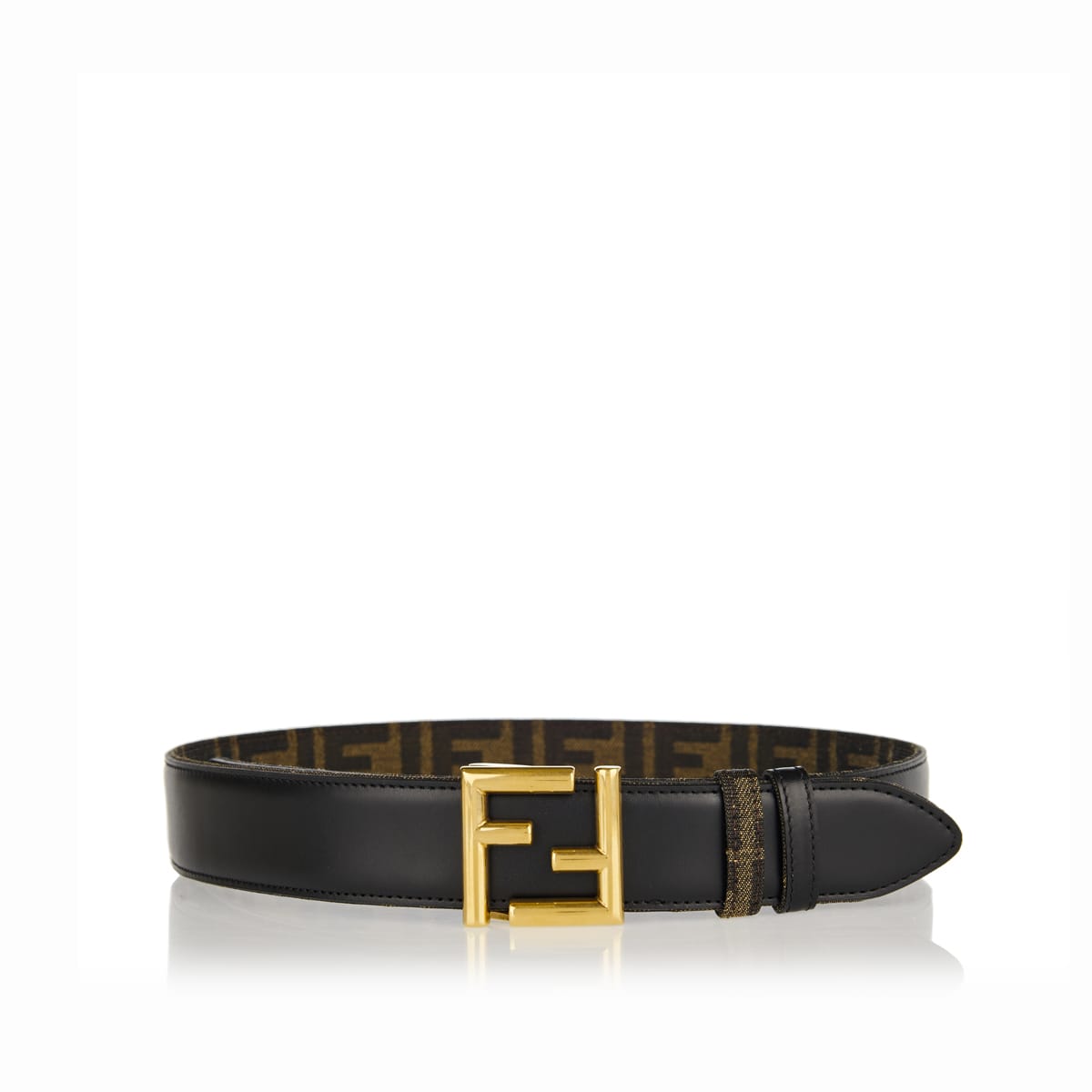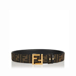 This reversible leather Fendi belt secures with FF buckle with stud closure and two loops. It features PU lining with FF motif in brown and black.