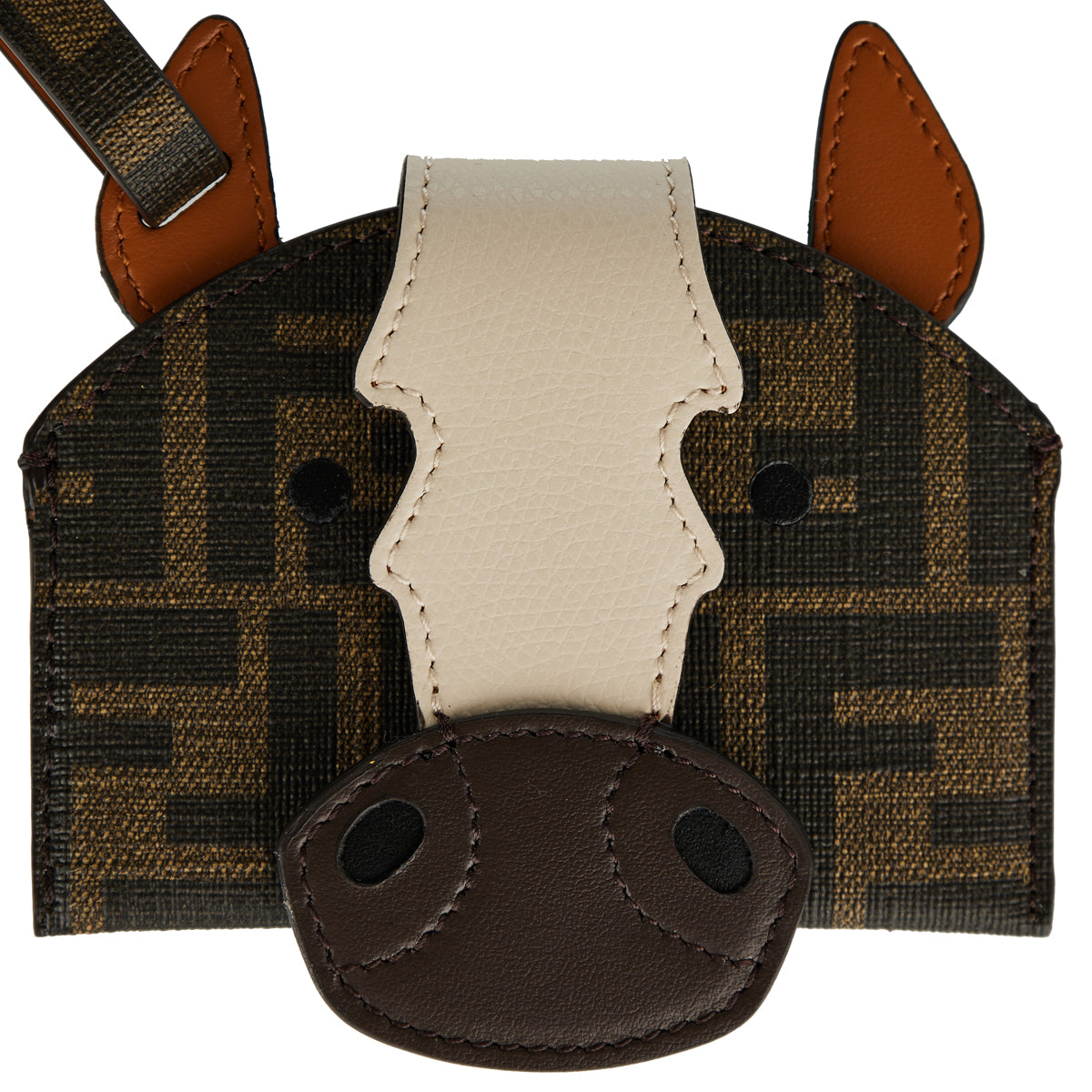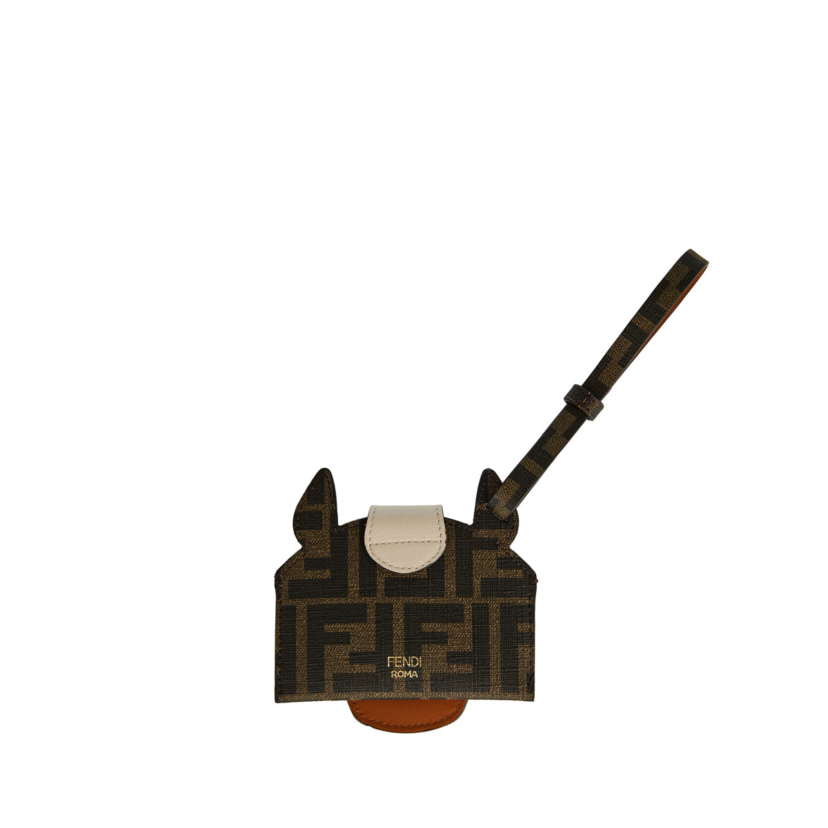 A refined card holder combining FF fabric and brown leather, ideal for luxury everyday essentials or elevated formal occasions. It features the iconic FF motif, a leather strap for versatility, gold-finish metalware, and a playful horse-head clasp bridge. Perfect when style must be both functional and polished.