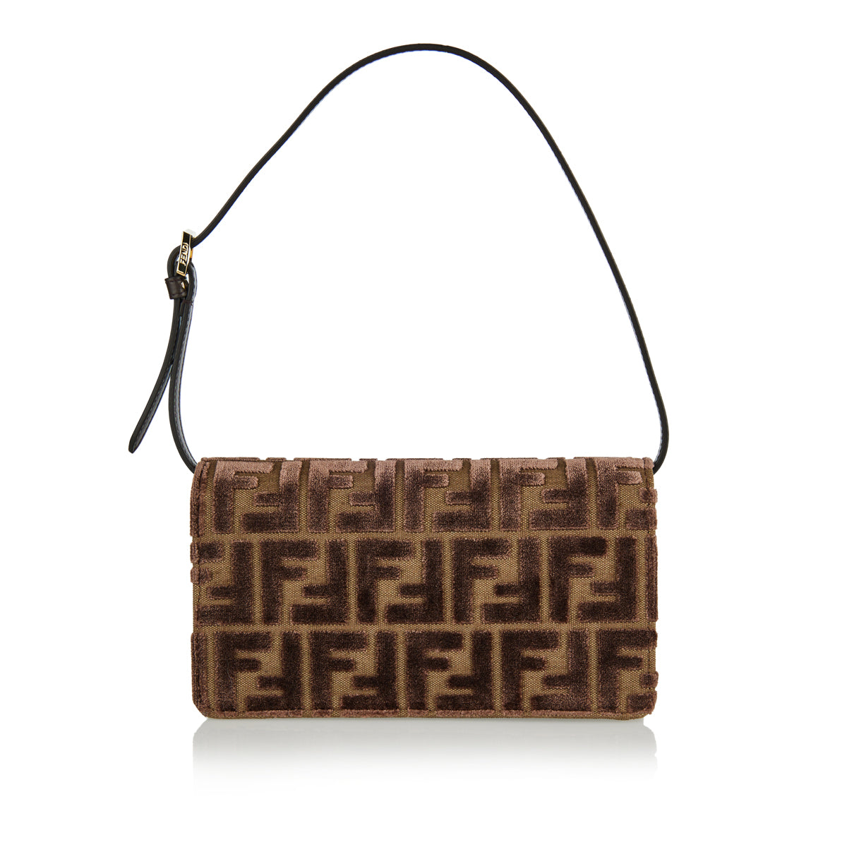 A compact and sophisticated wallet, crafted in brown velvet with a 3D-effect FF jacquard pattern. Tone-on-tone leather details and the iconic FF buckle closure complete the design, while the removable gold chain strap makes it versatile to carry by hand, on the shoulder, or crossbody. A refined and feminine accessory, perfect for any occasion.