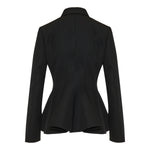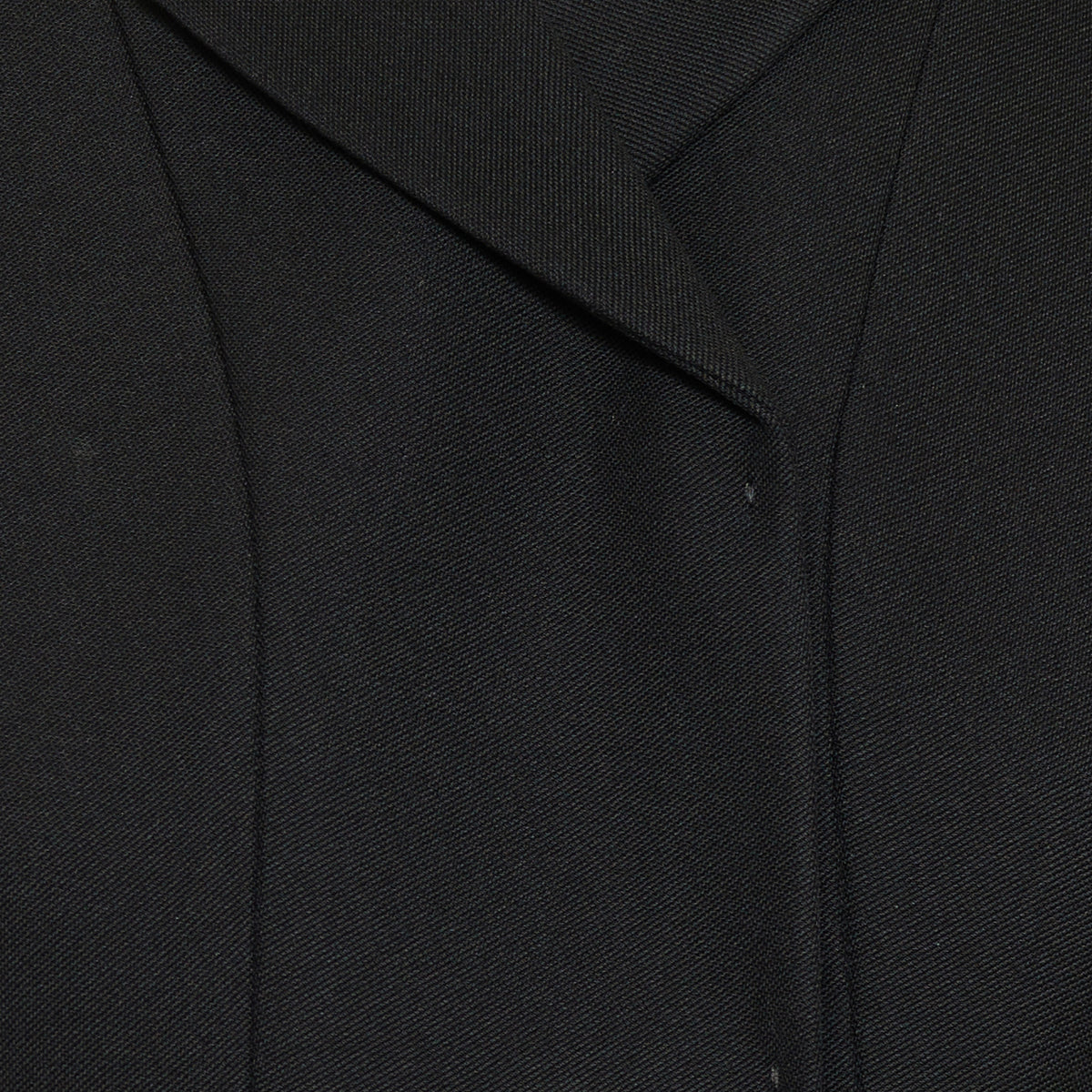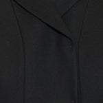 A tailored black jacket from Fendi, crafted from 100% virgin wool in a refined grain de poudre weave. This double-breasted design features a V-neck with peak lapels, structured shoulders, and a peplum detail at the hem, creating a flattering silhouette. The jacket is lined and fastens with a concealed hook closure at the front.