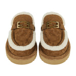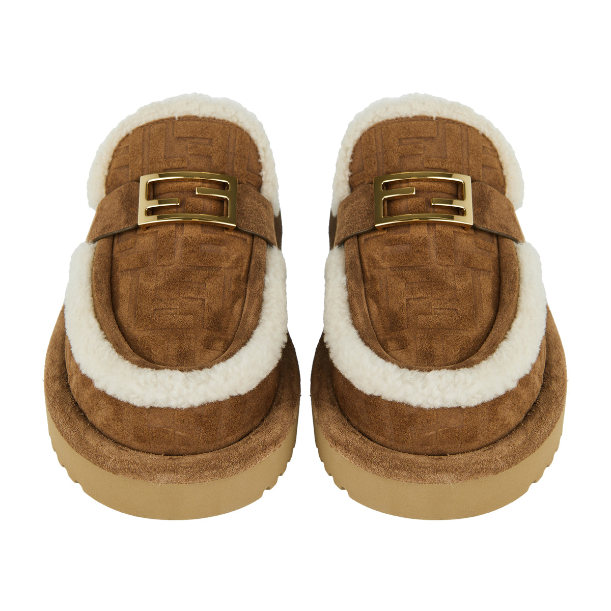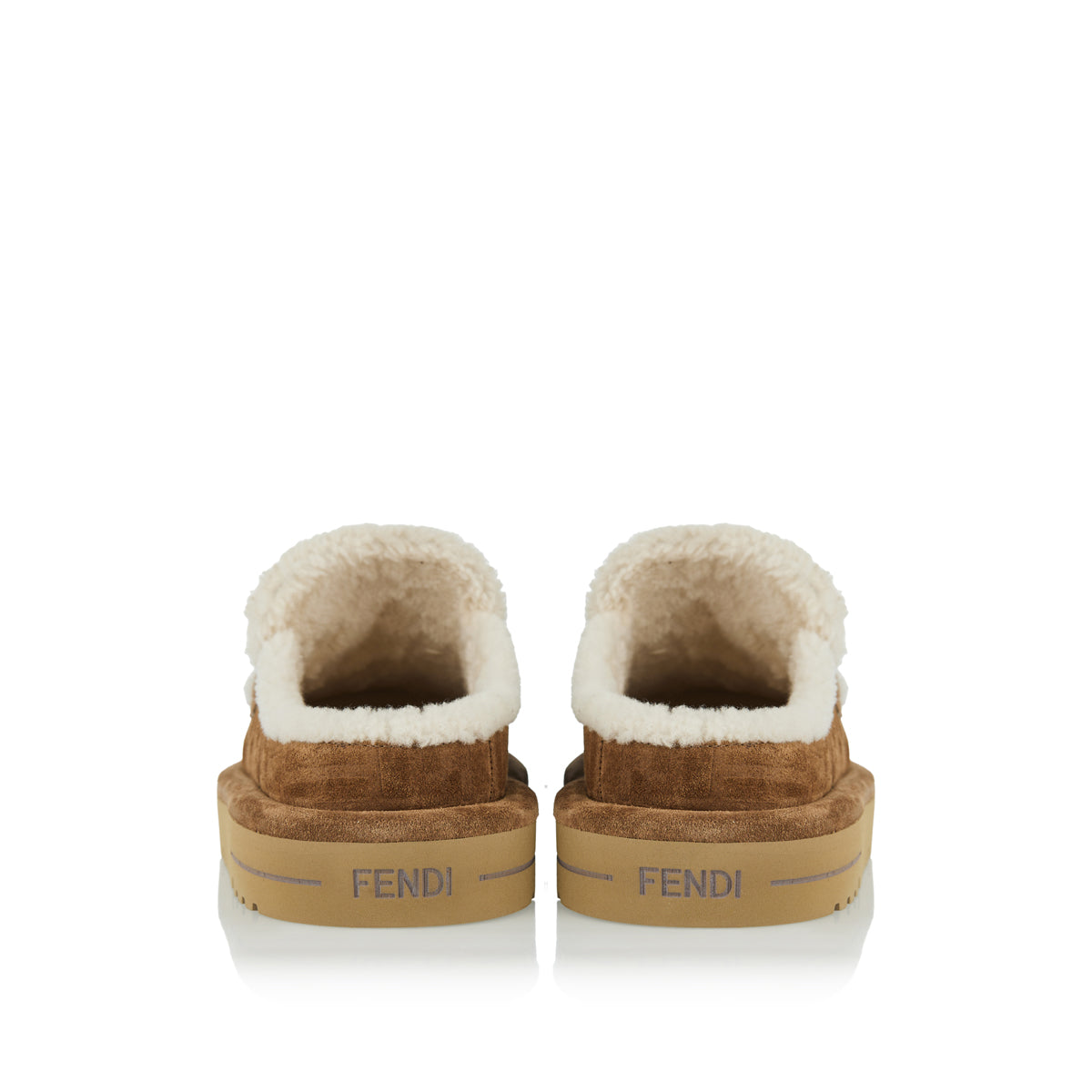 The Fendi Apres Chic sabots combine luxurious brown suede with a tone-on-tone embossed FF motif. Lined and trimmed with white shearling, they feature a gold-finish metal Baguette accessory and a chunky rubber sole with a contrasting insert and Fendi lettering on the heel. Made in Italy, these après-ski-inspired footwear pieces offer both style and comfort.