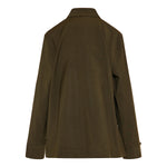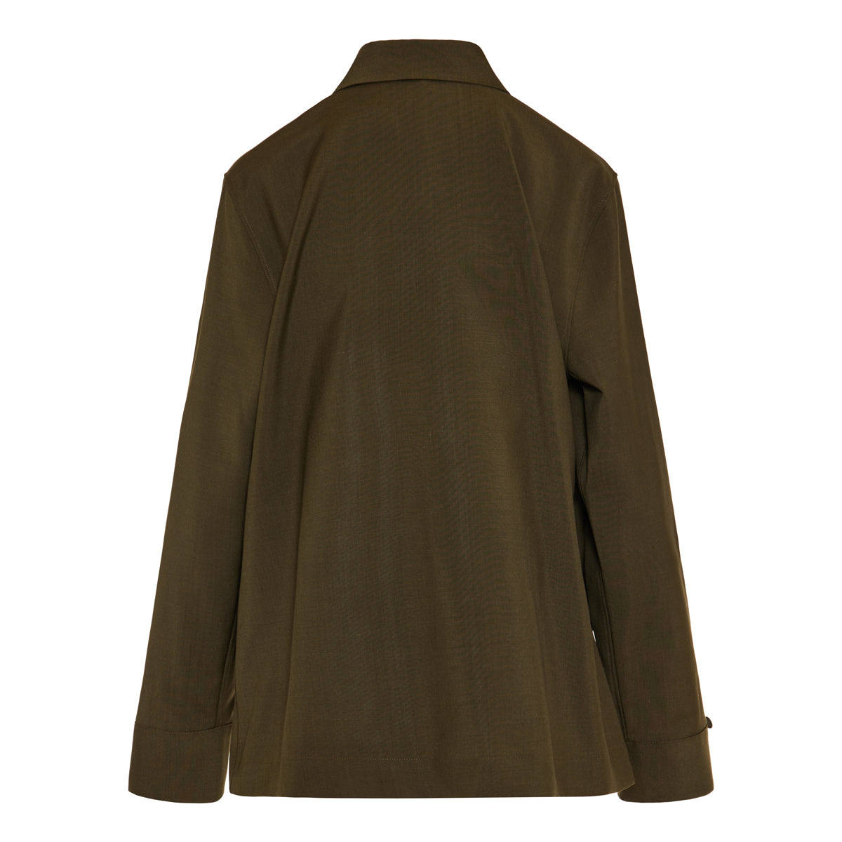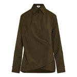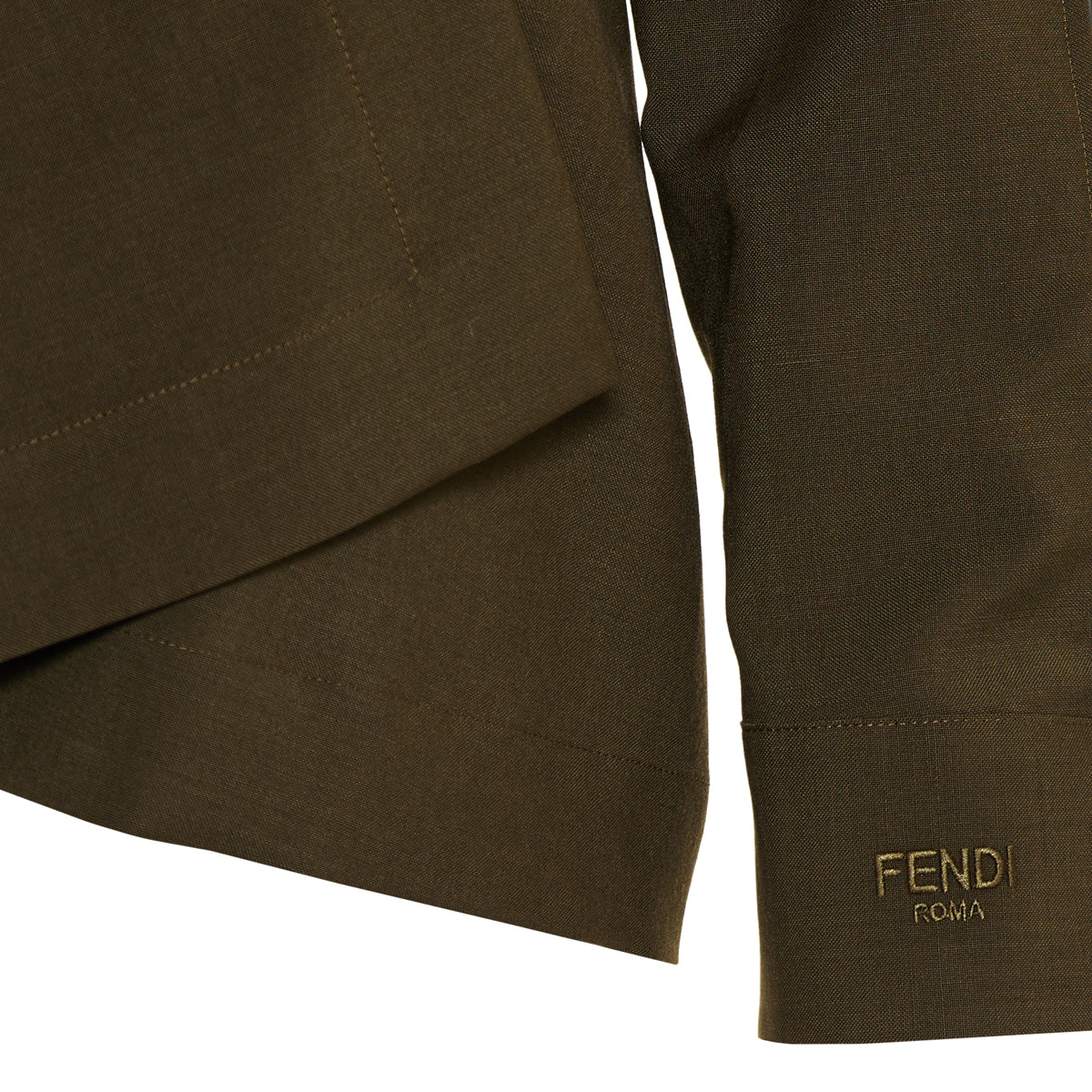 This olive green shirt is crafted from a luxurious wool and mohair blend, featuring a crossover silhouette with a shirt collar and wide buttoned cuffs. The asymmetrical fastening with a small side button creates a draped motif on the side and a cut-out detail on the neckline. Embroidered Fendi Roma logo on the left-side cuff. Ideal for formal occasions or refined layering.