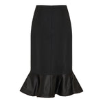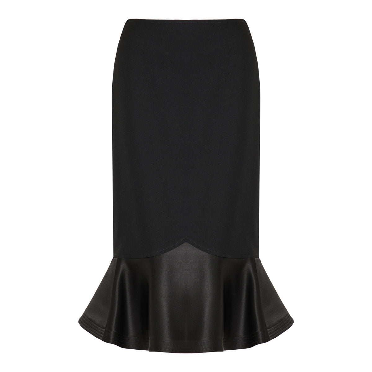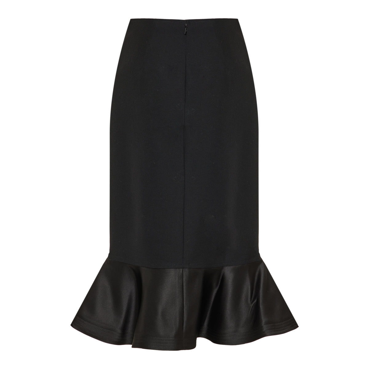 A sophisticated midi skirt from Fendi, crafted from 100% virgin wool in a refined grain de poudre weave. This high-waisted design features a flared silhouette with a satin peplum detail at the hem, adding a touch of elegance. The skirt is lined and fastens with a back invisible zip closure.