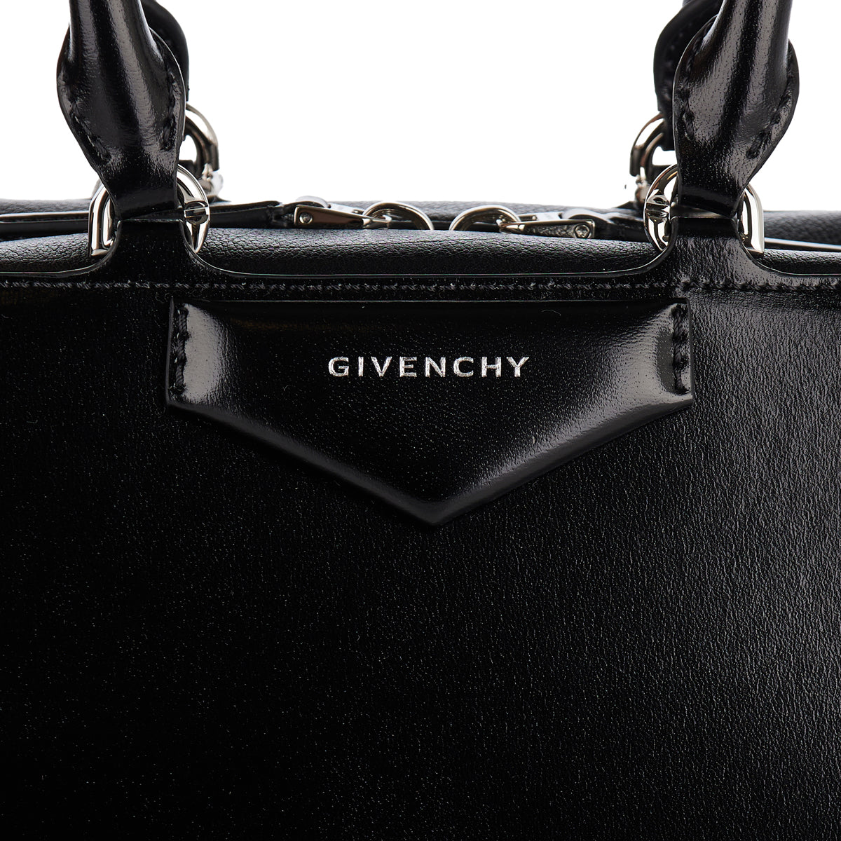 Givenchy’s Small Antigona East-West bag is crafted from luxurious black box leather and features the house’s signature structured silhouette. Detailed with a tonal logo patch and a removable shoulder strap, it’s a versatile accessory for both day and evening wear.