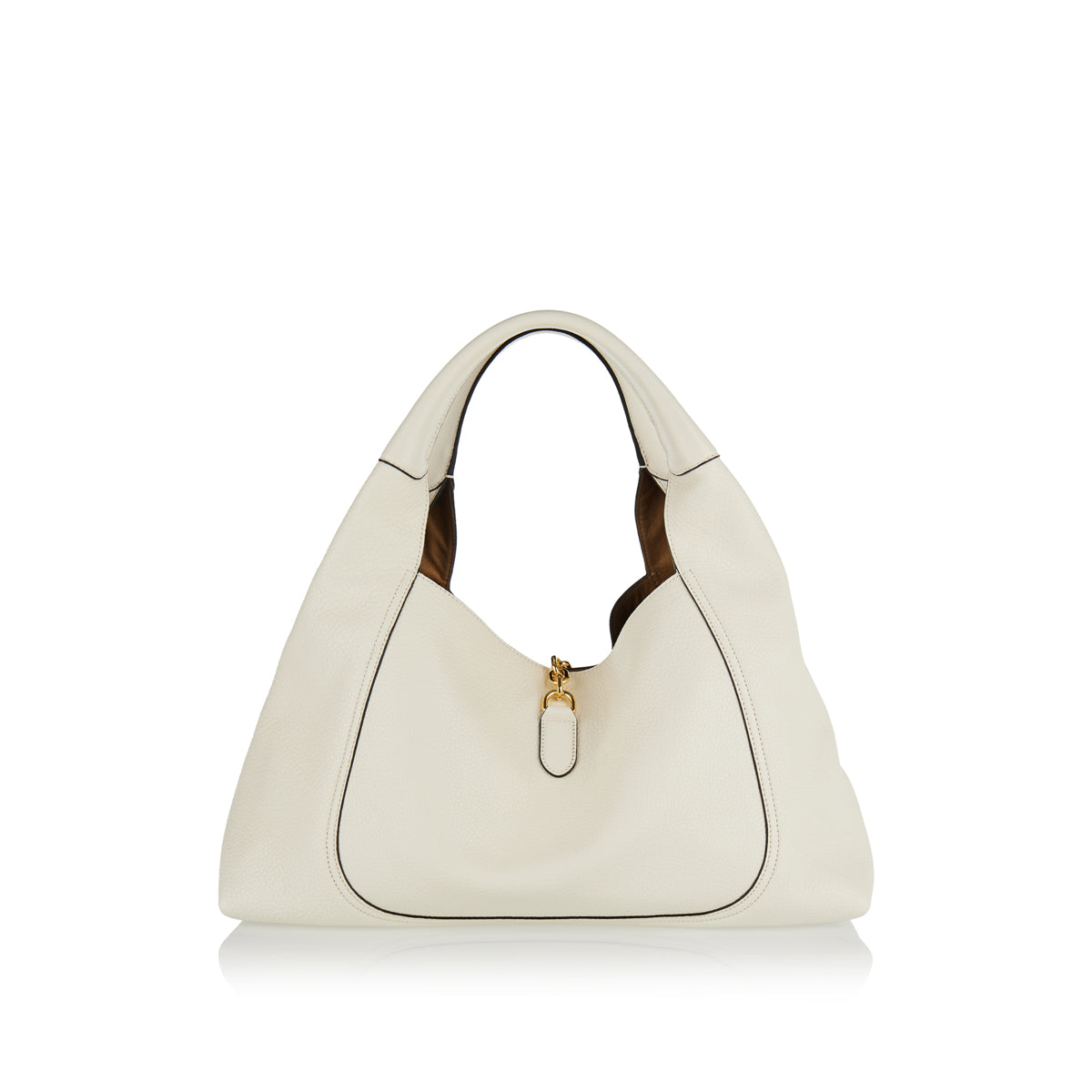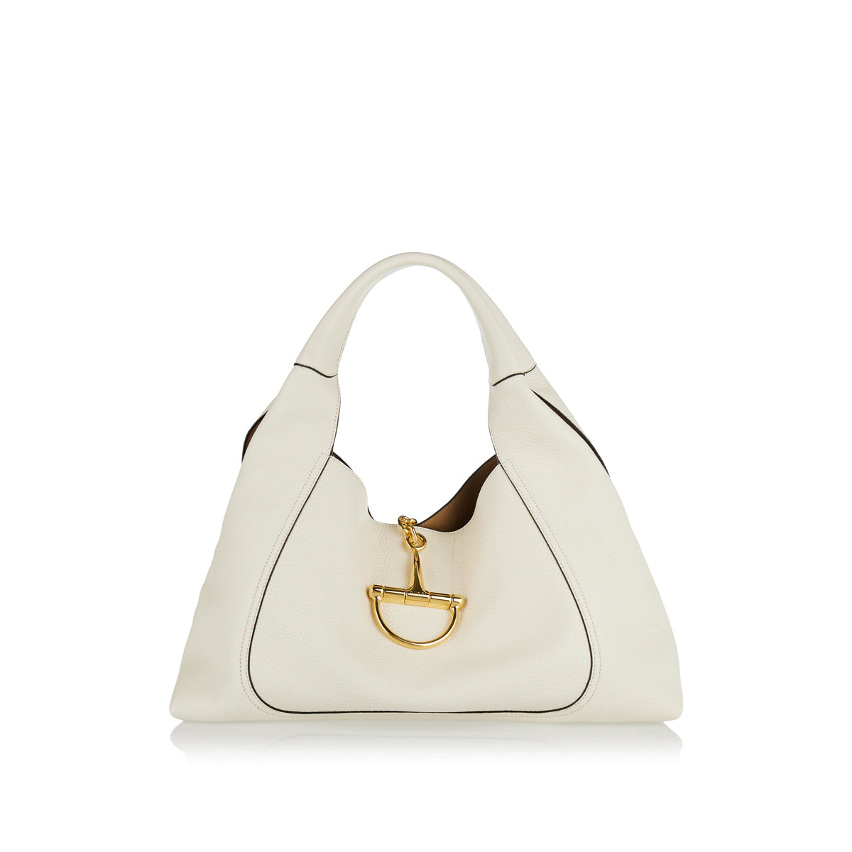 This Gucci Softbit Maxi shoulder bag reimagines the House’s signature Horsebit as a large half-Horsebit magnetic closure. Crafted from supple, grainy leather, it features gold-tone hardware, a detachable interior pouch, and a 20 cm shoulder drop. The relaxed silhouette offers generous capacity while maintaining elegant luxury.
