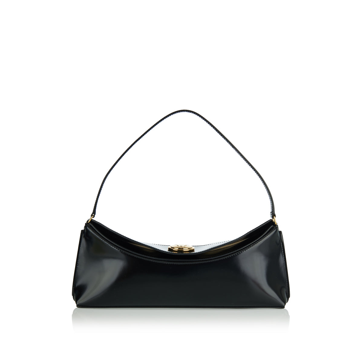 The Ovalo Clutch by Jacquemus is a minimalist folded shoulder bag crafted from 100% calf leather with a glazed finish. It features a slim shoulder strap, magnetic flap with a large engraved snap fastener, and is fully lined in cotton with an interior card pocket. Made in France, this compact clutch measures 35 cm x 10 cm x 4 cm, offering a refined silhouette suitable for both day and evening wear.