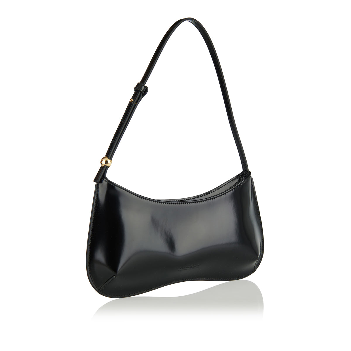 The Jacquemus Le Bisou shoulder bag is a sleek silhouette in glazed calf leather with silver-tone hardware. Featuring a zip closure, adjustable strap with engraved bead, and compact proportions, it embodies modern elegance. A versatile mini bag designed for both day and evening wear.