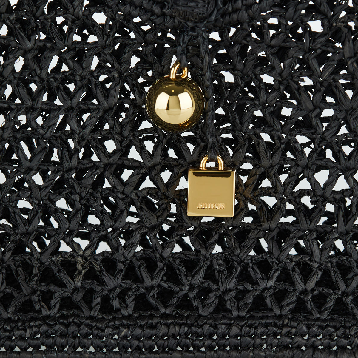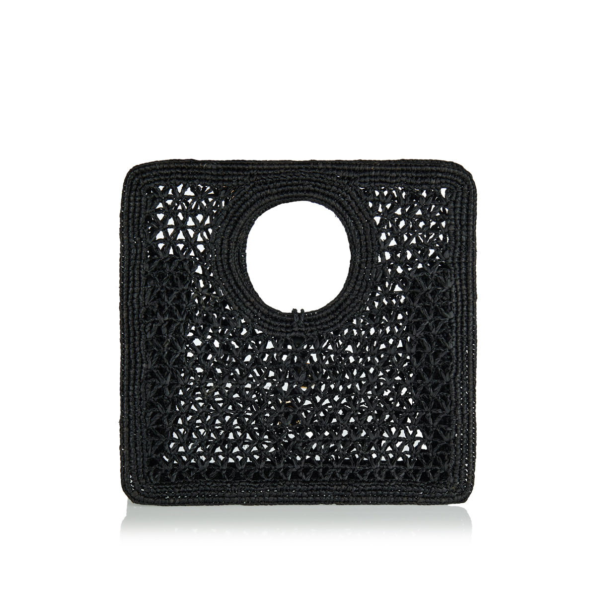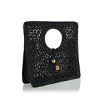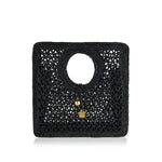 This black raffia square bag is flat woven and monkey fit closure with gold-plated circle and square charms.