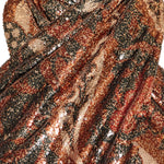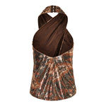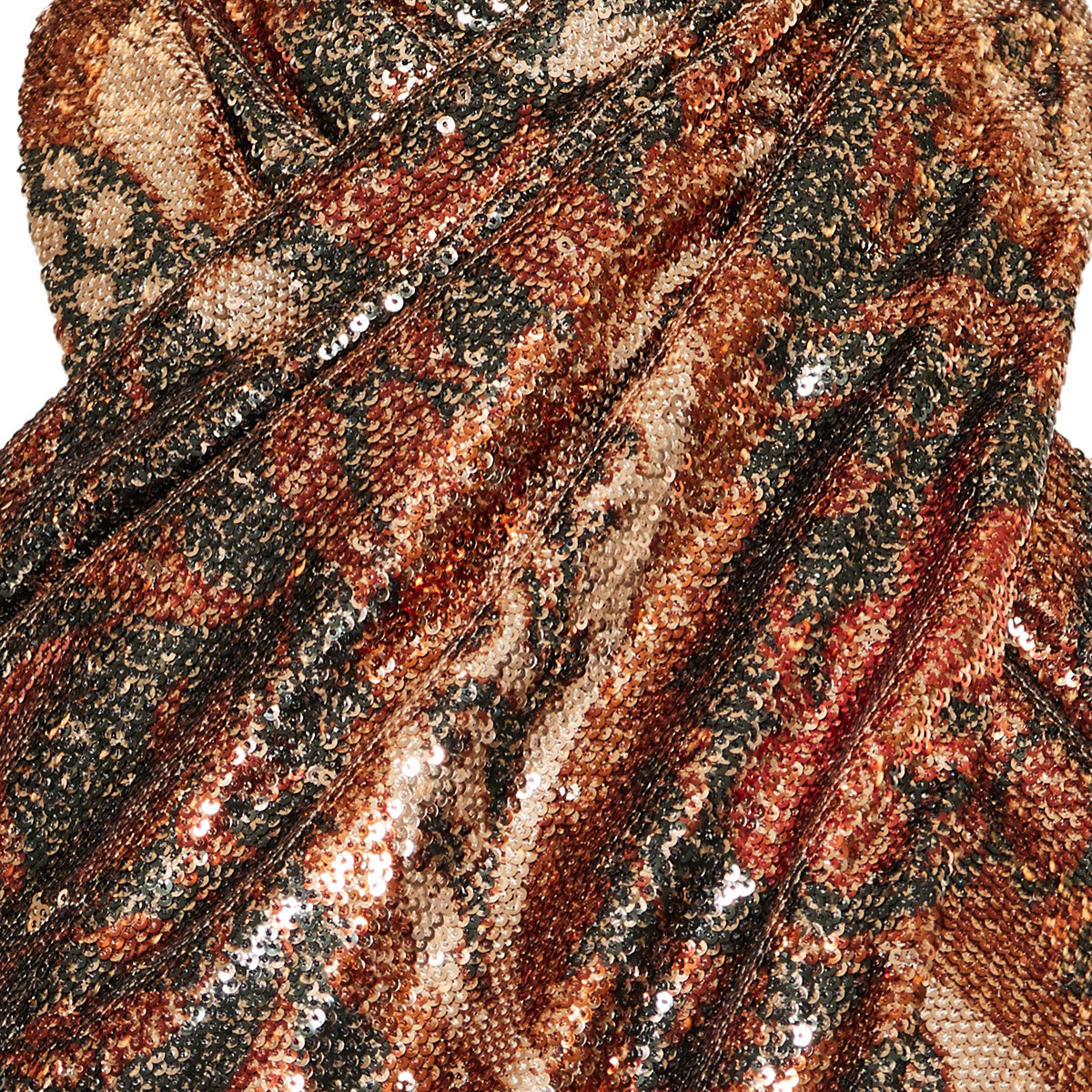 This halter-style top by Johanna Ortiz features a sequin-embellished crossover front and an asymmetrical hem, designed to catch the light and add texture and contrast when paired with structured tailoring or soft draping.