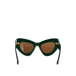 These sculptural JW Anderson butterfly sunglasses are crafted from rich forest‑green acetate, blending bold shape with refined design. Their oversized frame offers a dramatic silhouette, while the included moulded leather case and branded cleaning cloth elevate the presentation. Sophisticated and striking for both daywear and statement looks.