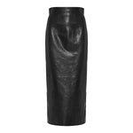 The Loxley pencil skirt from Khaite is crafted in supple black lambskin, lined in silk, and features a high-rise silhouette with a back slit.