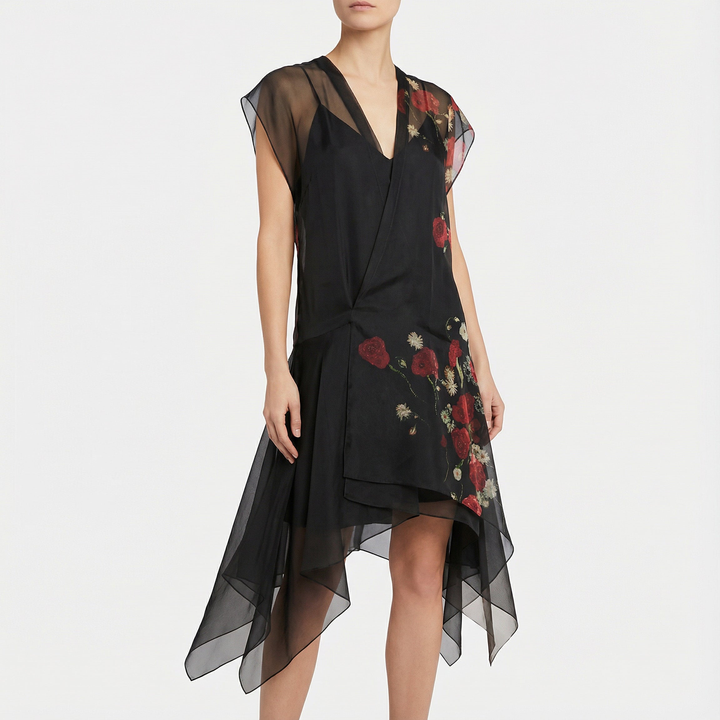 The Merith dress is crafted from 100% silk chiffon to produce a fluid, ethereal silhouette with an asymmetrical hem and a painterly floral motif in red and burgundy on a black base. Its deep V-neckline and layered translucent drape make it ideal for elegant evening events or refined occasions where graceful movement and subtle drama matter.