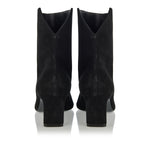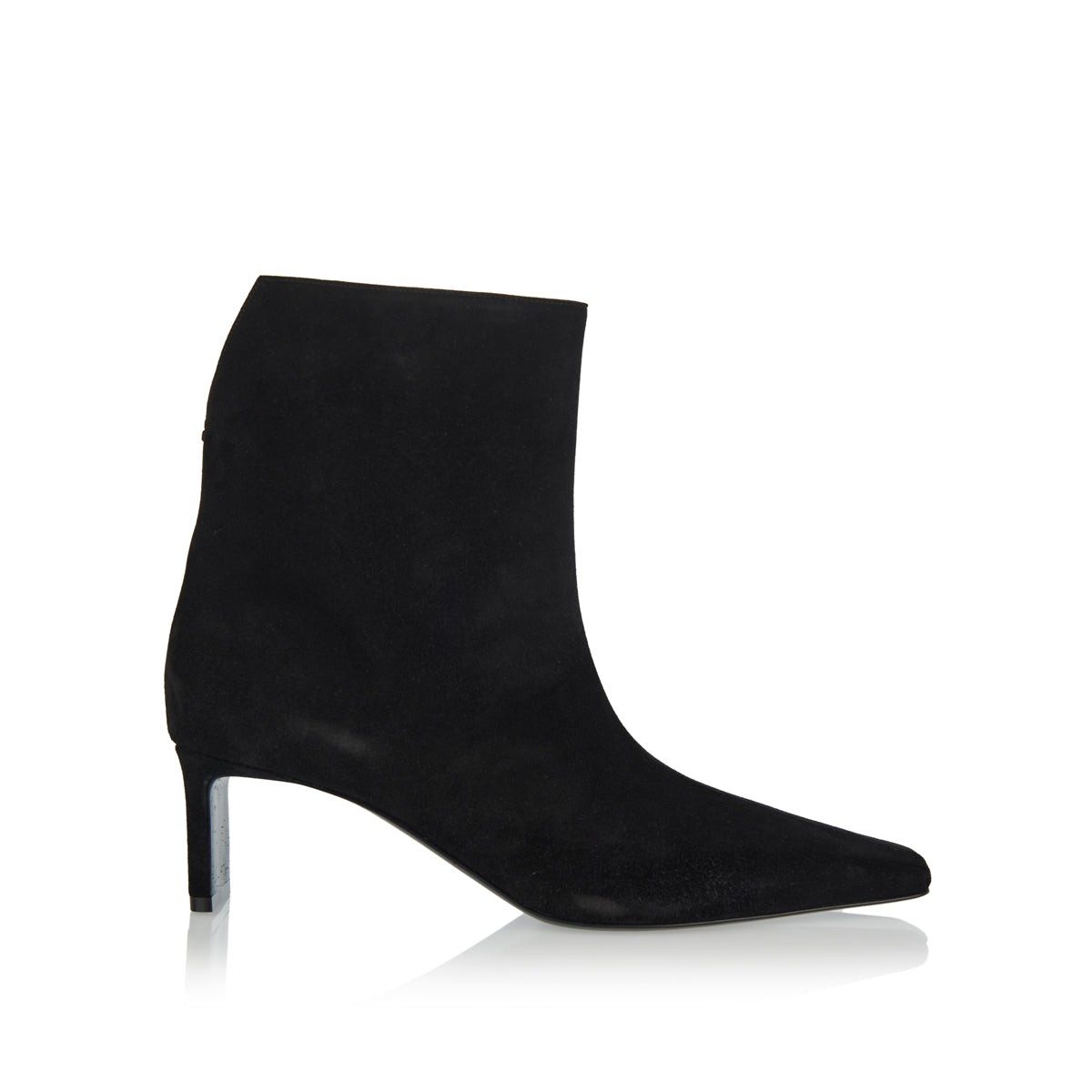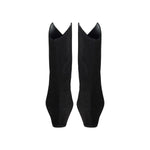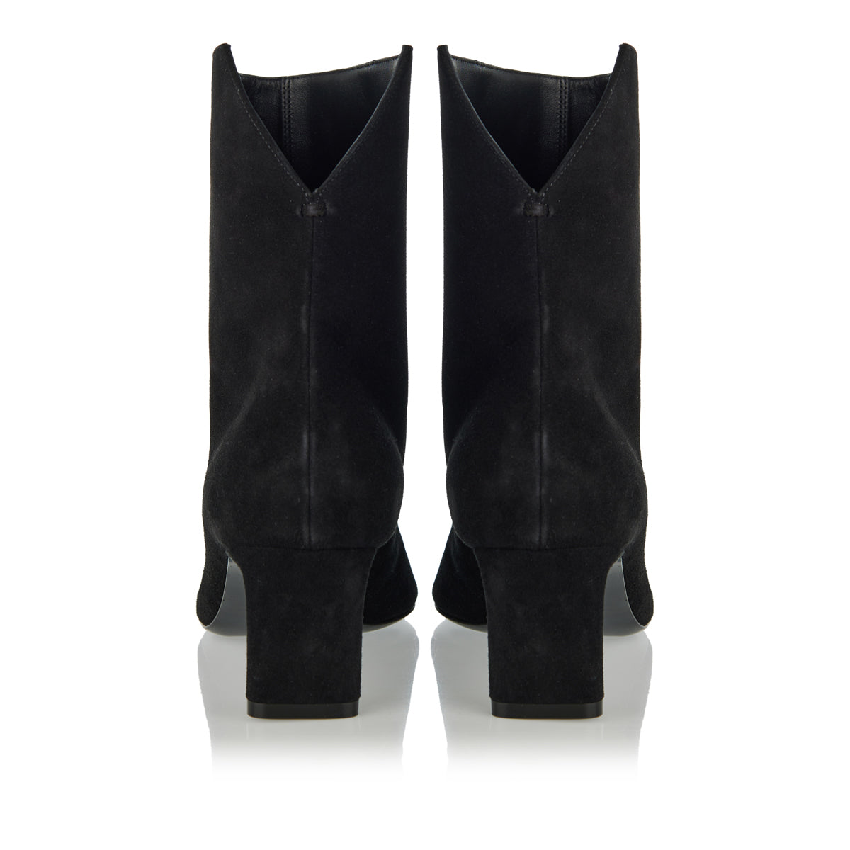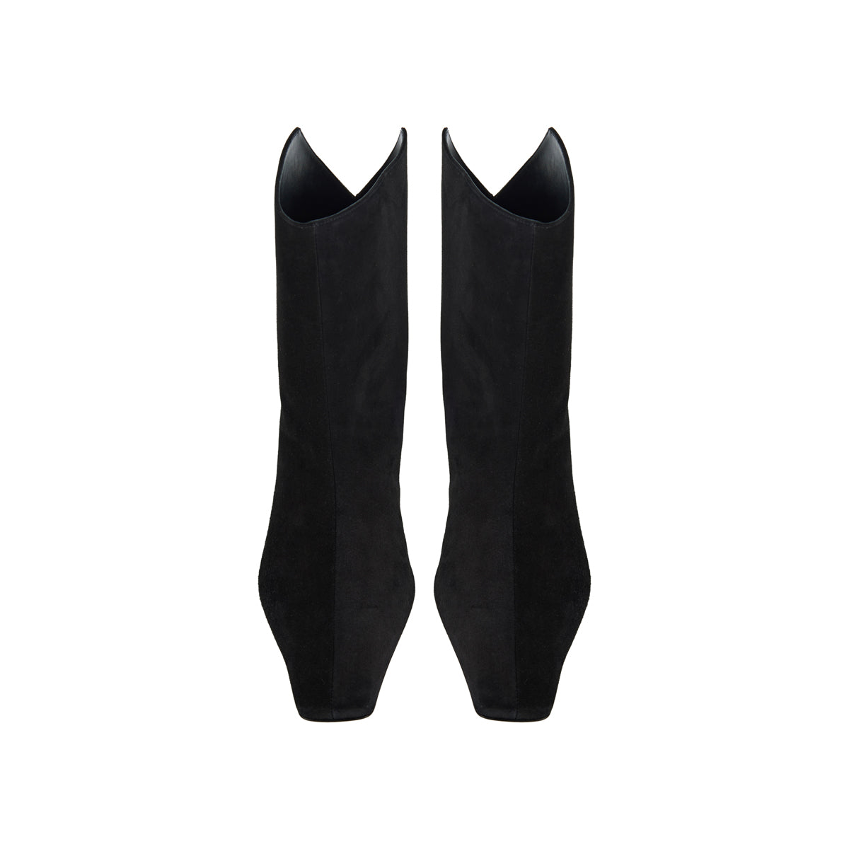 These high-ankle boots by Khaite are crafted from soft calf suede, featuring a sharp, narrow 55 mm heel and a distinctive cut-out at the back cuff for ease of wear. With a square toe and elegant silhouette, they combine architectural style and modern sophistication — ideal for elevated daywear or refined evening looks.
