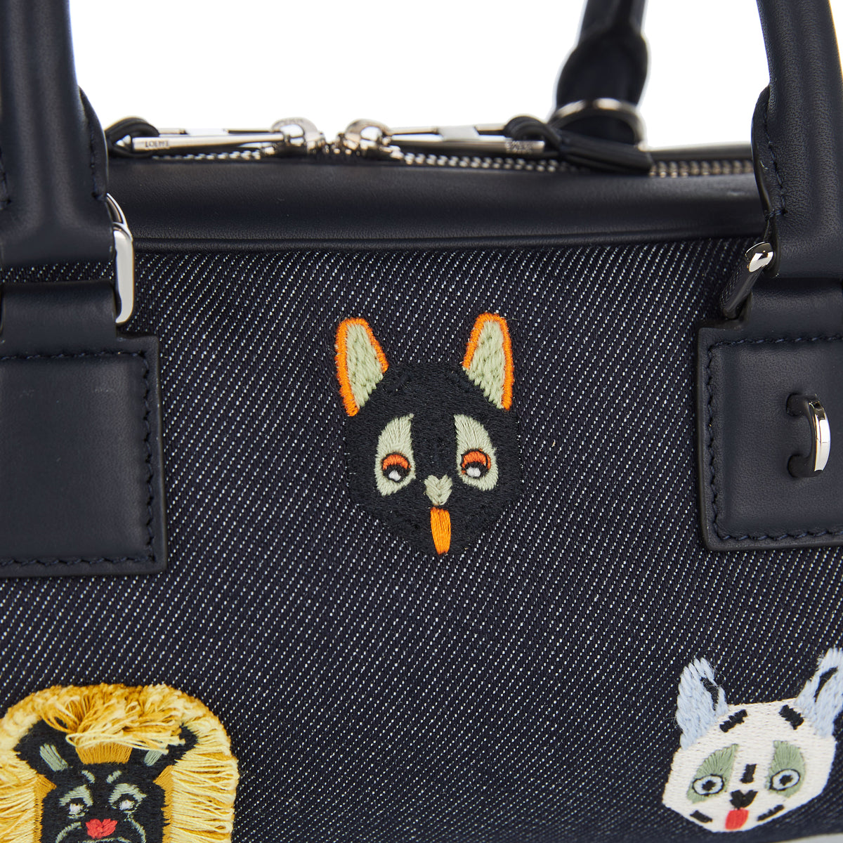 This re‑imagined take on Loewe’s archival Amazona silhouette features structured top‑handles, a detachable cross‑body strap and the house’s embossed Anagram – rendered in smooth blue calfskin, and enriched with the same embroidered Cats motif.