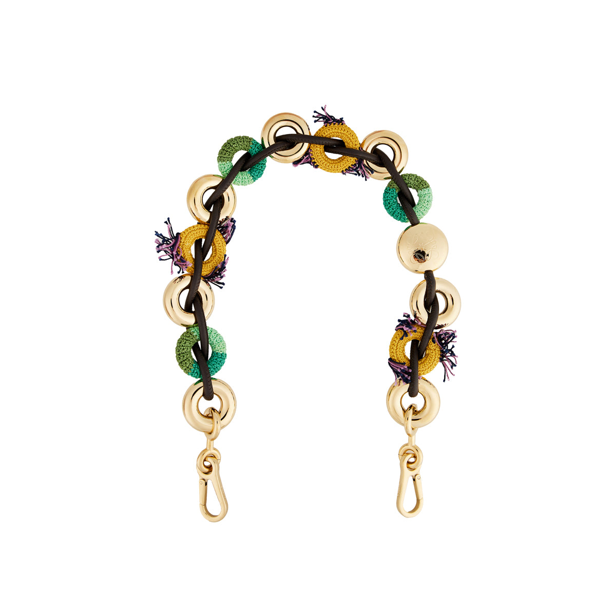 The Donut chain strap by Loewe is a contemporary accessory designed to personalize and enhance everyday bags. Crafted in supple leather with polished silver-tone donut-shaped chain links, it combines functionality with sculptural elegance. Its versatile length allows for styling across shoulder or crossbody bags, making it a distinctive detail that reflects Loewe’s innovative craftsmanship and playful design language.