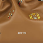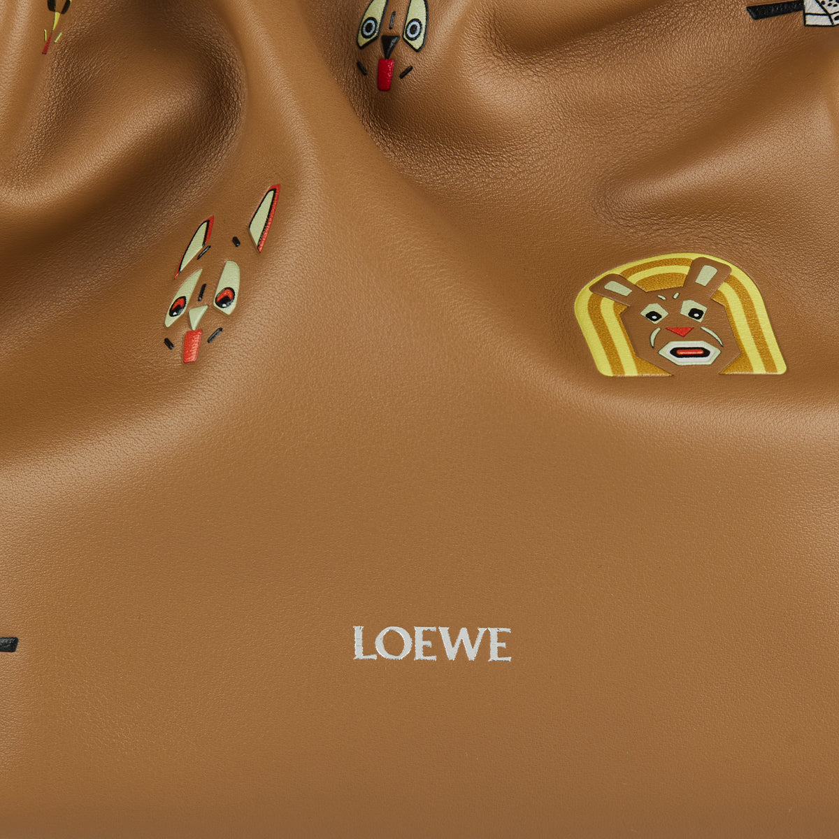 A soft, slouchy mini clutch from Loewe, crafted in supple nappa calfskin and adorned with all-over 3D-effect cat prints for a playful yet sophisticated finish. The signature drawstring closure with knotted ends gives the bag a relaxed silhouette while the adjustable strap allows for shoulder, crossbody or hand carry. Perfect for refined casual ensembles or stylish daytime outings — a distinctive accessory that blends craftsmanship and character.