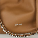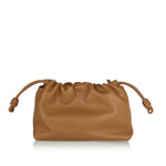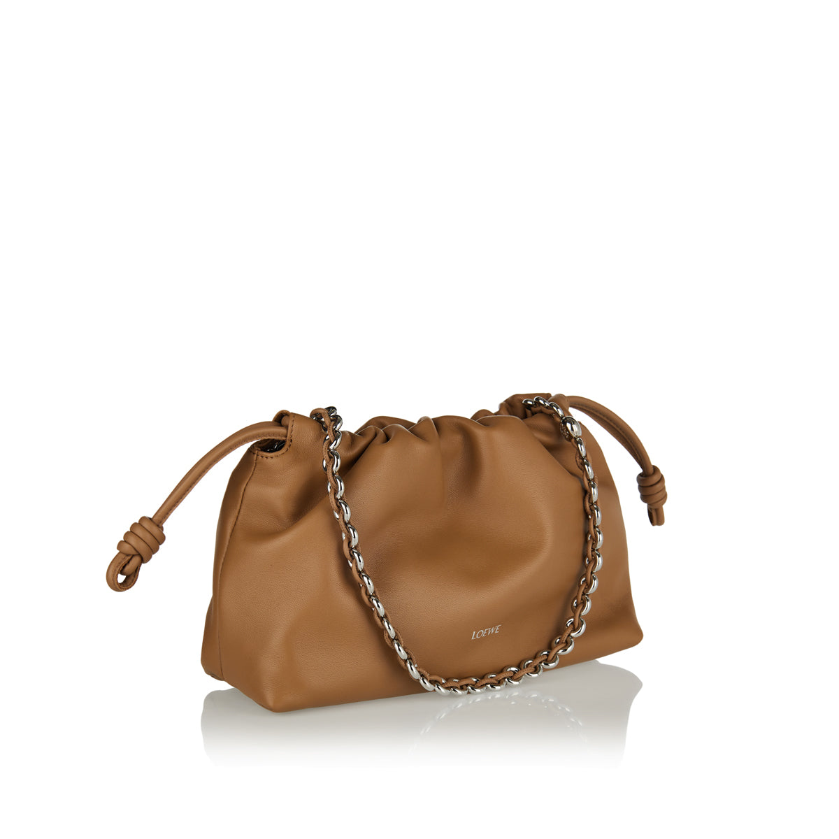 The Flamenco Purse is made from leather in a ruched design detailed with Loewe's signature knots at the sides. It comes with detachable chain strap and removable leather strap. Shoulder, crossbody or hand carry.