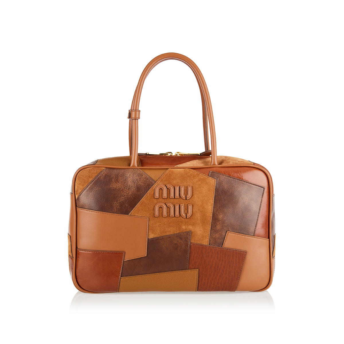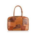 A compact top-handle bag crafted from patchwork lambskin, featuring leather handles, a leather lettering logo, and gold-tone hardware.