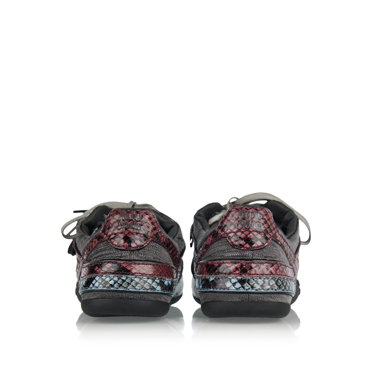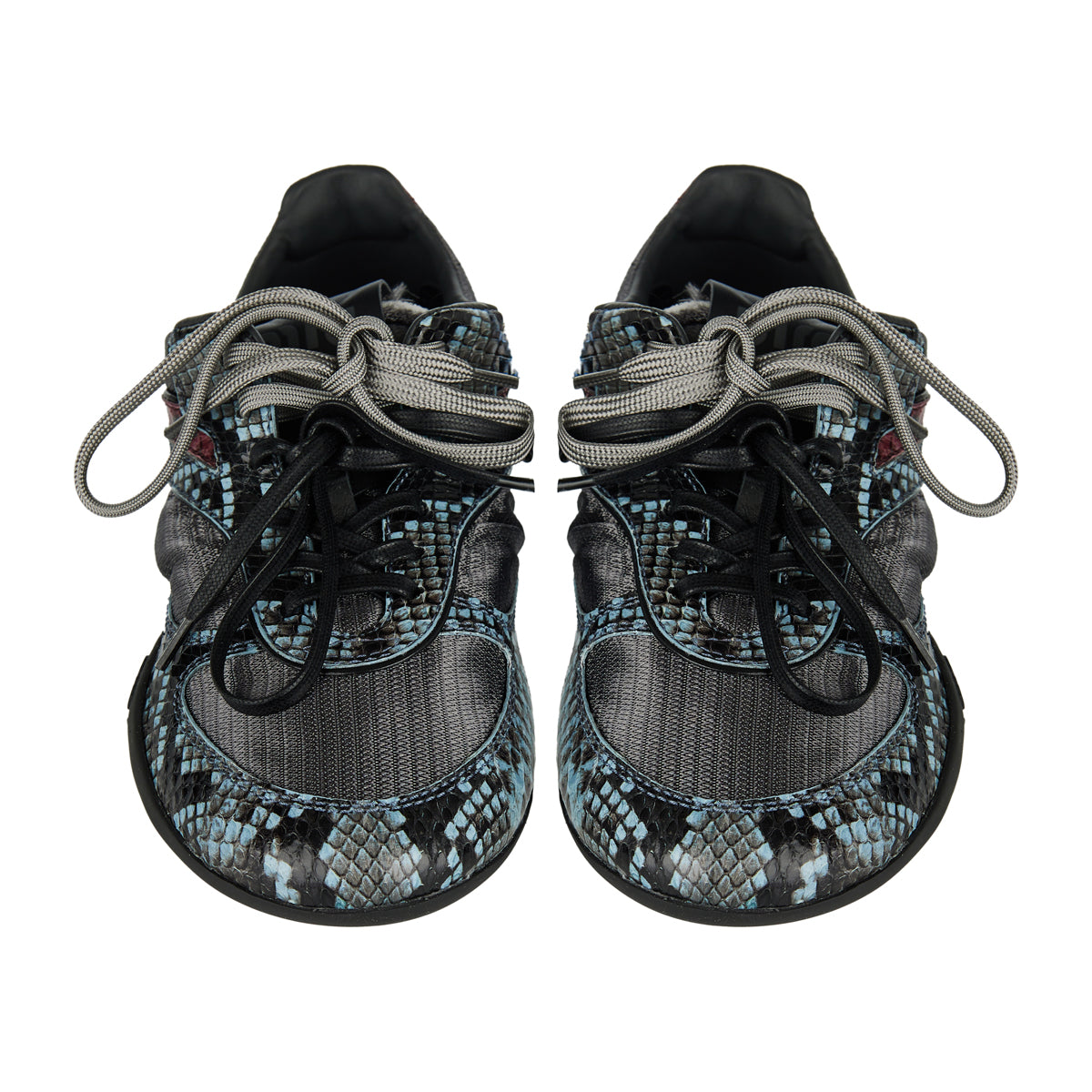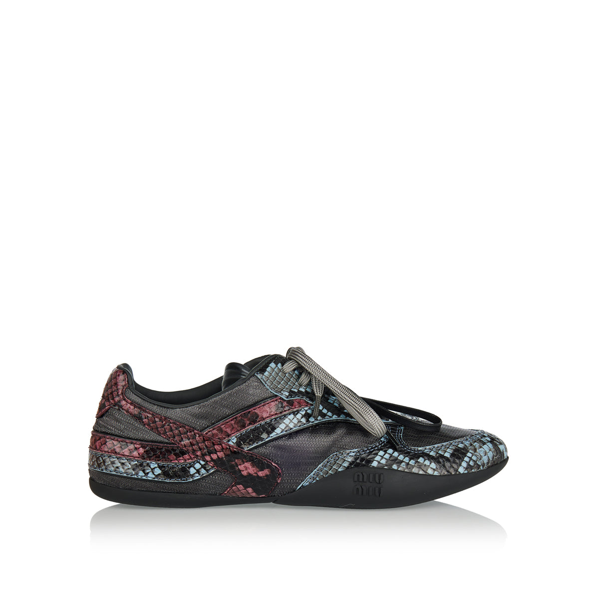 Miu Miu’s Gymnasium sneakers fuse lightweight technical fabric with python-print Ayers leather inserts for a bold statement. Designed with a lace-up vamp, reinforced round toe, and logo details, they offer sporty sophistication ideal for elevated streetwear.