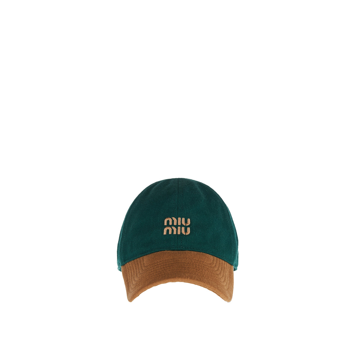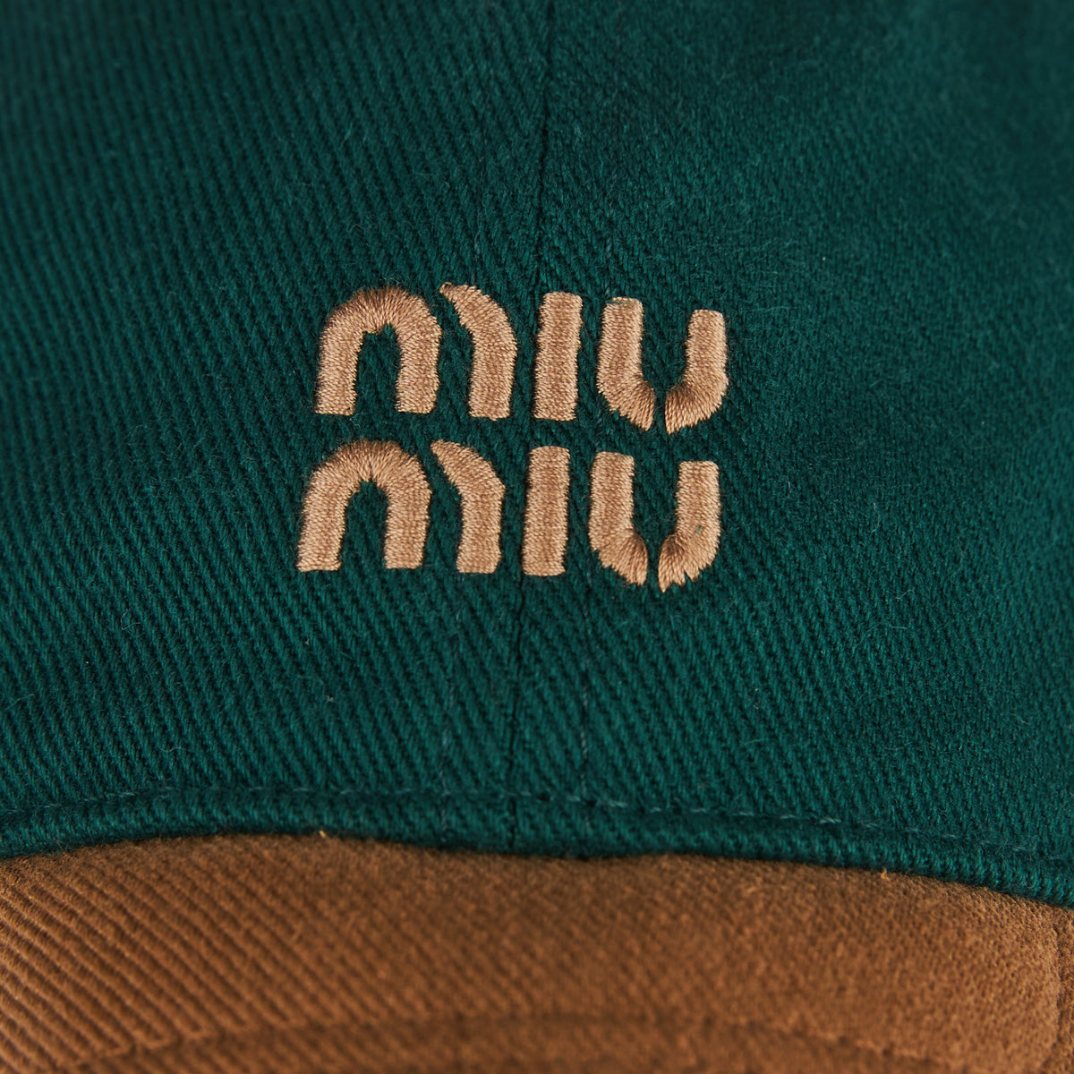A bold accessory by Miu Miu crafted in 100% cotton drill with a washed effect that enhances the contrasting billiard and cork tones, featuring an embroidered logo—perfect for refined sporty or elevated casual wear.