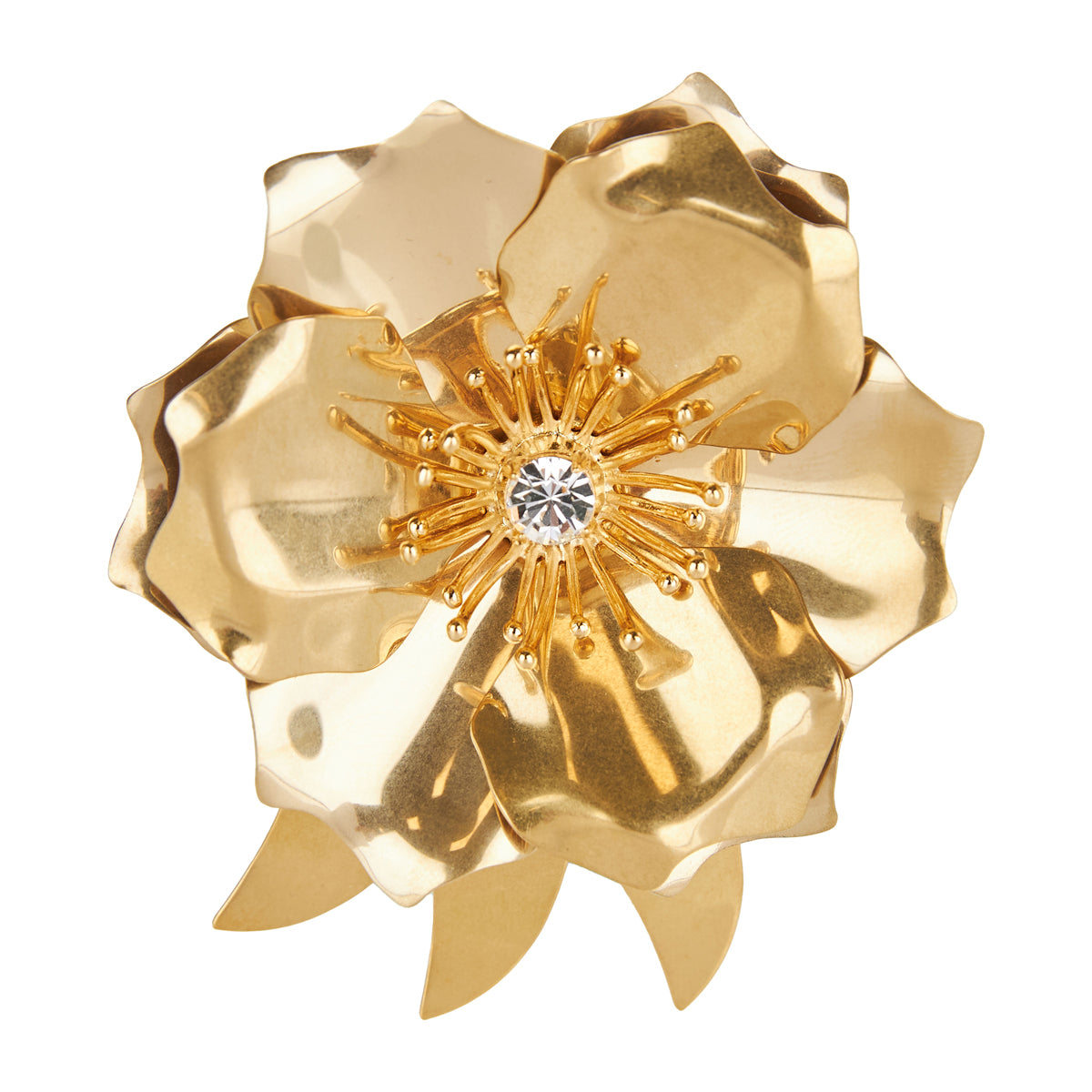 A sculptural brooch by Miu Miu in gold‑tone metal, set with a central crystal, ideal for refined finishing touches on luxury outerwear or evening attire.