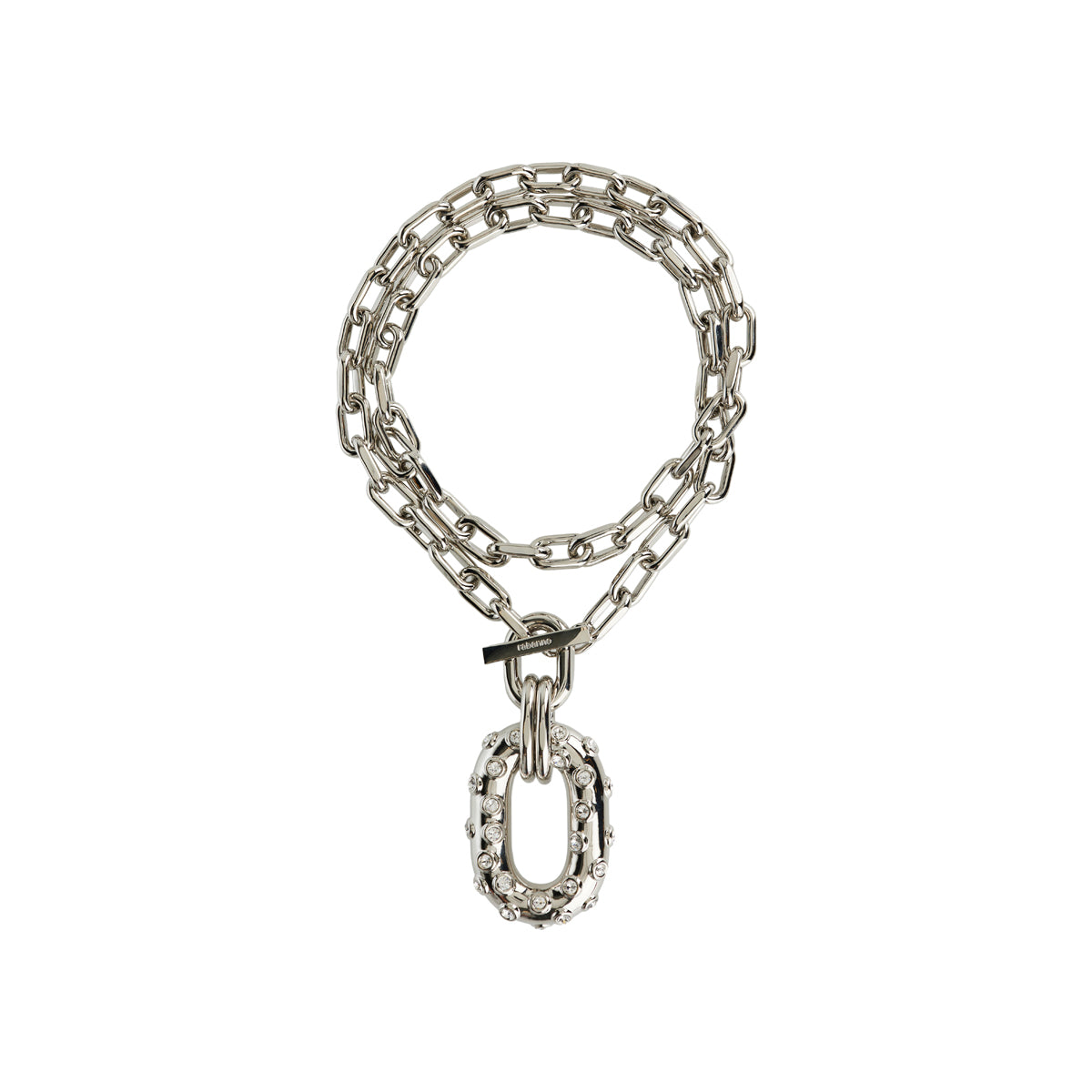 The Rabanne XL Link Strass Necklace is a bold statement piece that combines classic chain design with contemporary flair. Crafted from brass, it features interlinked small and oversized links adorned with rhinestones, offering a touch of sparkle to any ensemble.